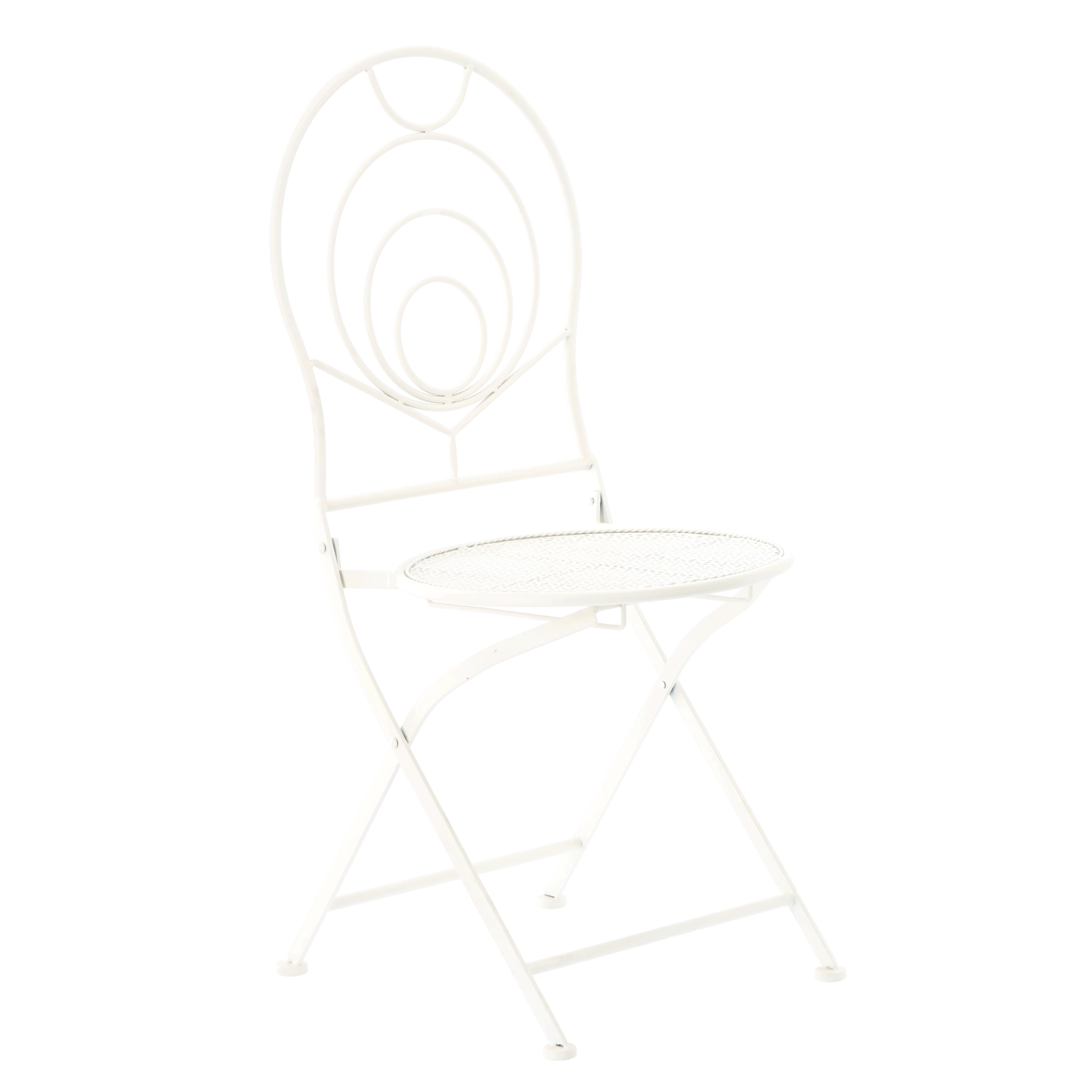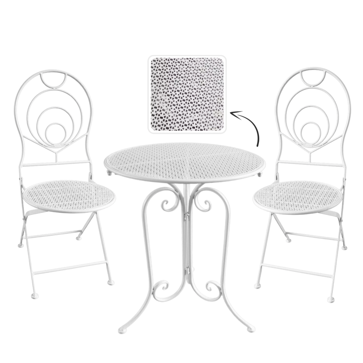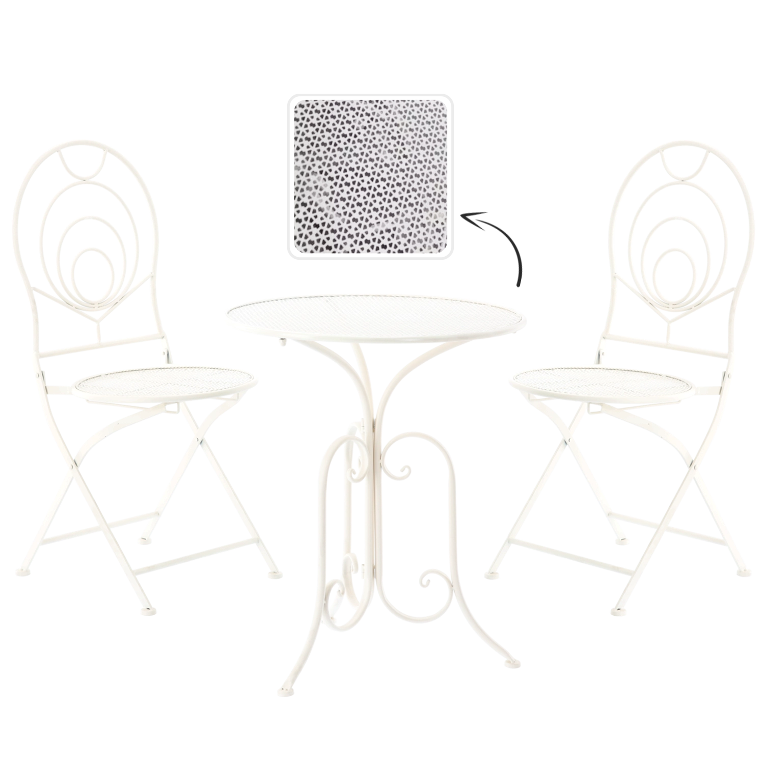 A székek összecsukhatók, így a kávészünet után a szett kis helyen is gyorsan elpakolható. A kerek asztal kényelmes felületet kínál italoknak vagy dekorációknak. Az univerzális fehér színnek és a retró díszítésnek köszönhetően a szett ideális kertekbe, kávézókba és vintage stílusú enteriőrökbe.