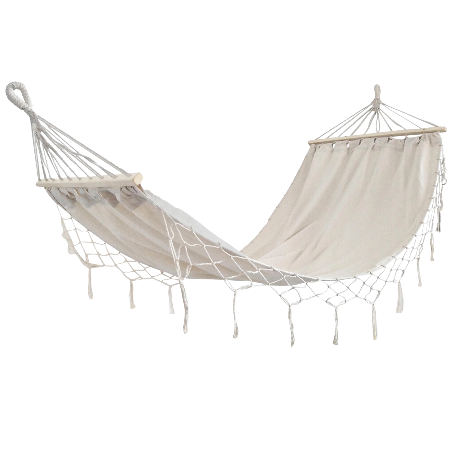 Ez a bézs, bojtokkal díszített függőágy a dizájn és a funkcionalitás tökéletes ötvözete. A természetes árnyalat könnyen harmonizál a kültéri bútorokkal és a belső térrel is, miközben a fa távtartó rudak kényelmesen nyitva tartják a fekvőfelületet olvasáshoz, pihenéshez vagy egy rövid szundításhoz.