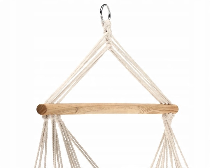 Az erős függesztő kötelek és a masszív fa rúd stabilitást biztosítanak, míg a kellemes pamut–poliészter keverék kényelmet és tartósságot nyújt. A 150 kg maximális teherbírás biztonságot ad a mindennapos használathoz.