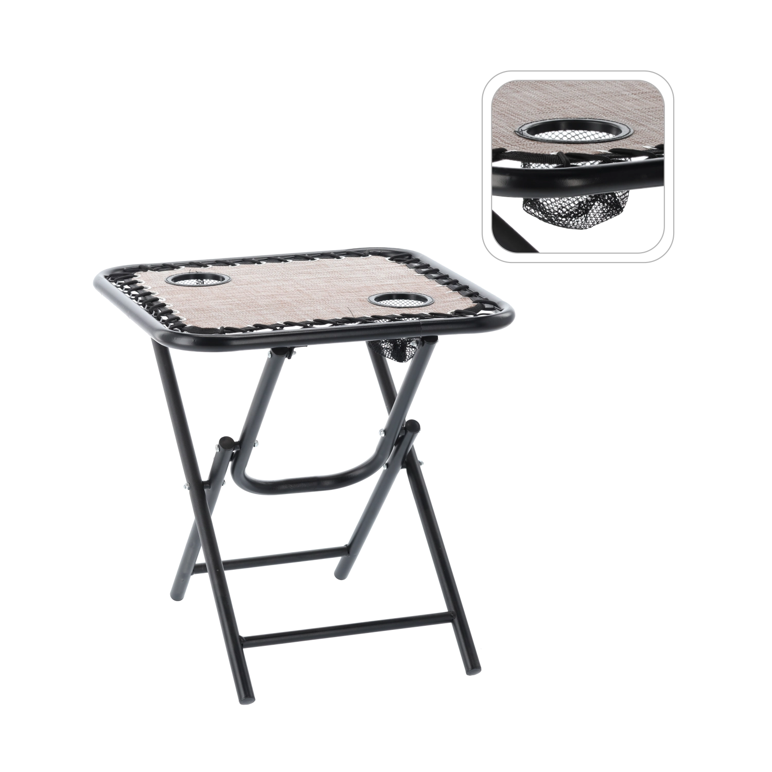 Megbízható, könnyen tárolható utazóasztalt keres? Ez a barna, 50 × 50 × 50 cm-es összecsukható túraasztal kiváló választás kempingezéshez, piknikhez, horgászathoz vagy a kertbe. A fém szerkezet stabilitást biztosít, míg az integrált italtartók biztonságosan rögzítik a poharakat és palackokat.