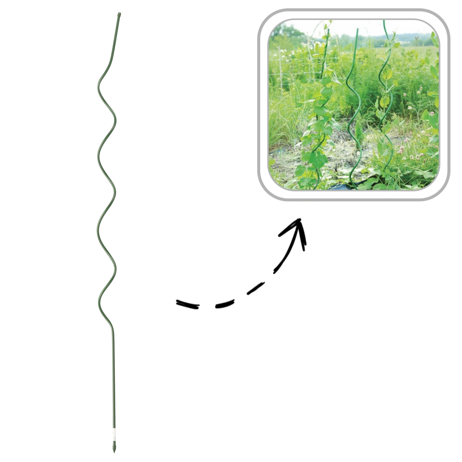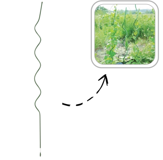 A spirál alak a szár teljes hosszán támaszt nyújt, és minimálisra csökkenti a kötözés szükségességét. Ideális paradicsomhoz, babhoz és uborkához.