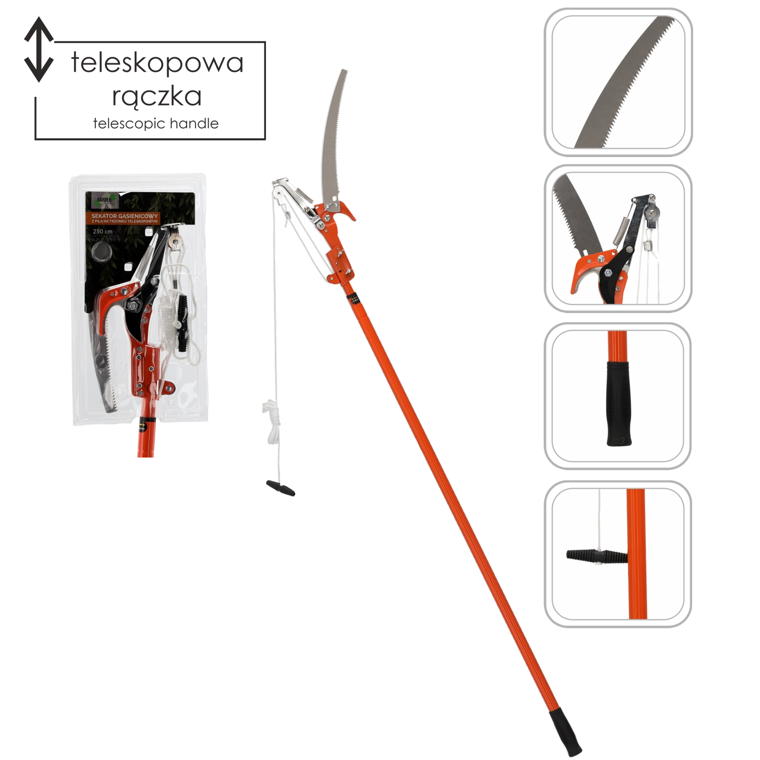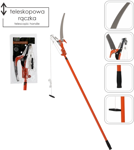 Ez a sokoldalú ágvágó egyesíti a bypass olló karos/köteles áttételének előnyeit és az ívelt kézifűrészt. Az eszköz tiszta vágást biztosít a vékonyabb ágaknál, míg a fűrésszel hatékony a vastagabb ágak vágásában – mindezt a földről. A legfeljebb 250 cm-es teleszkópos nyél kényelmes elérést ad mászás nélkül.