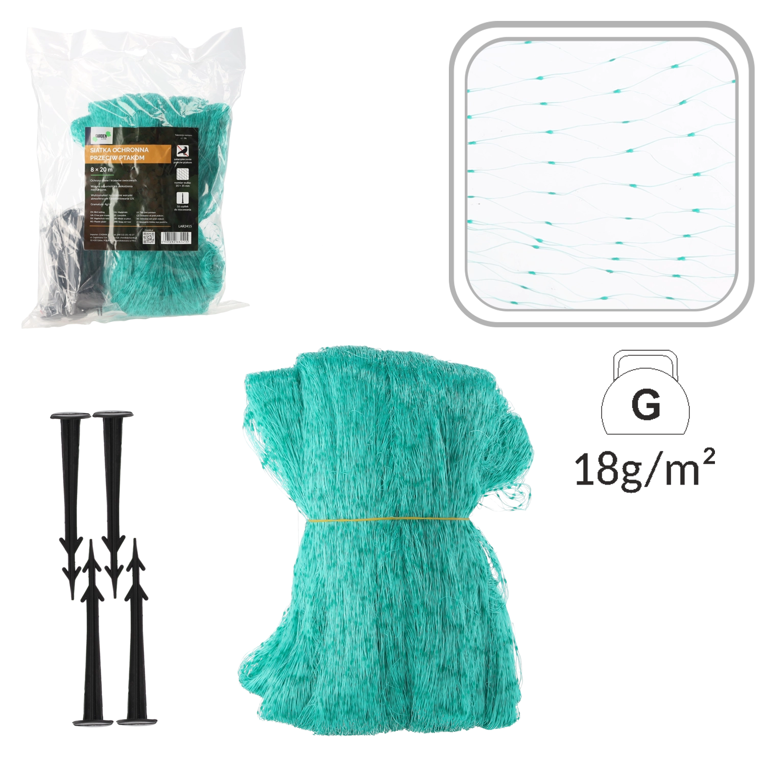 A strapabíró polipropilén hosszú élettartamot és több szezonon át tartó használatot garantál. A 35 × 35 mm szemméret hatékonyan akadályozza meg a madarak bejutását, ugyanakkor lehetővé teszi a növények szellőzését, és átengedi a fényt és az esőt. A telepítés gyors és egyszerű – a 16 rögzítő cövekkel a hálót szilárdan a talajhoz vagy a szerkezethez rögzítheti.