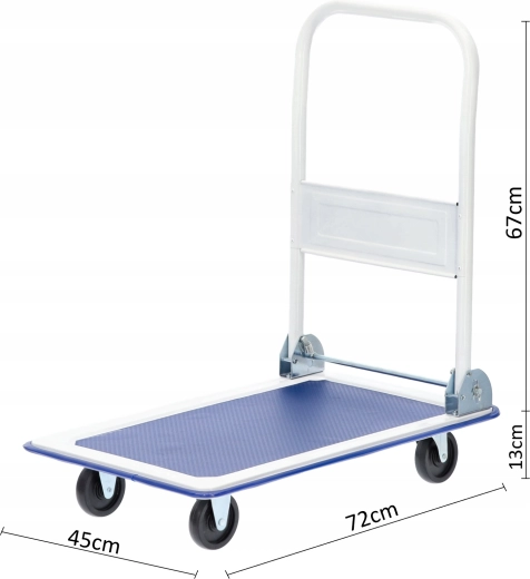 Praktikus platós kocsi 150 kg teherbírással és 72 × 45 × 80 cm kompakt méretekkel, amely megkönnyíti a csomagok, dobozok és anyagok szállítását otthon, irodában és raktárban. A összecsukható fogantyú és a 4 forgó kerék révén könnyen manőverezhető, munka után pedig minimális helyet foglal. A tartós konstrukció és a csúszásgátló felület biztonságos és stabil használatot biztosít.