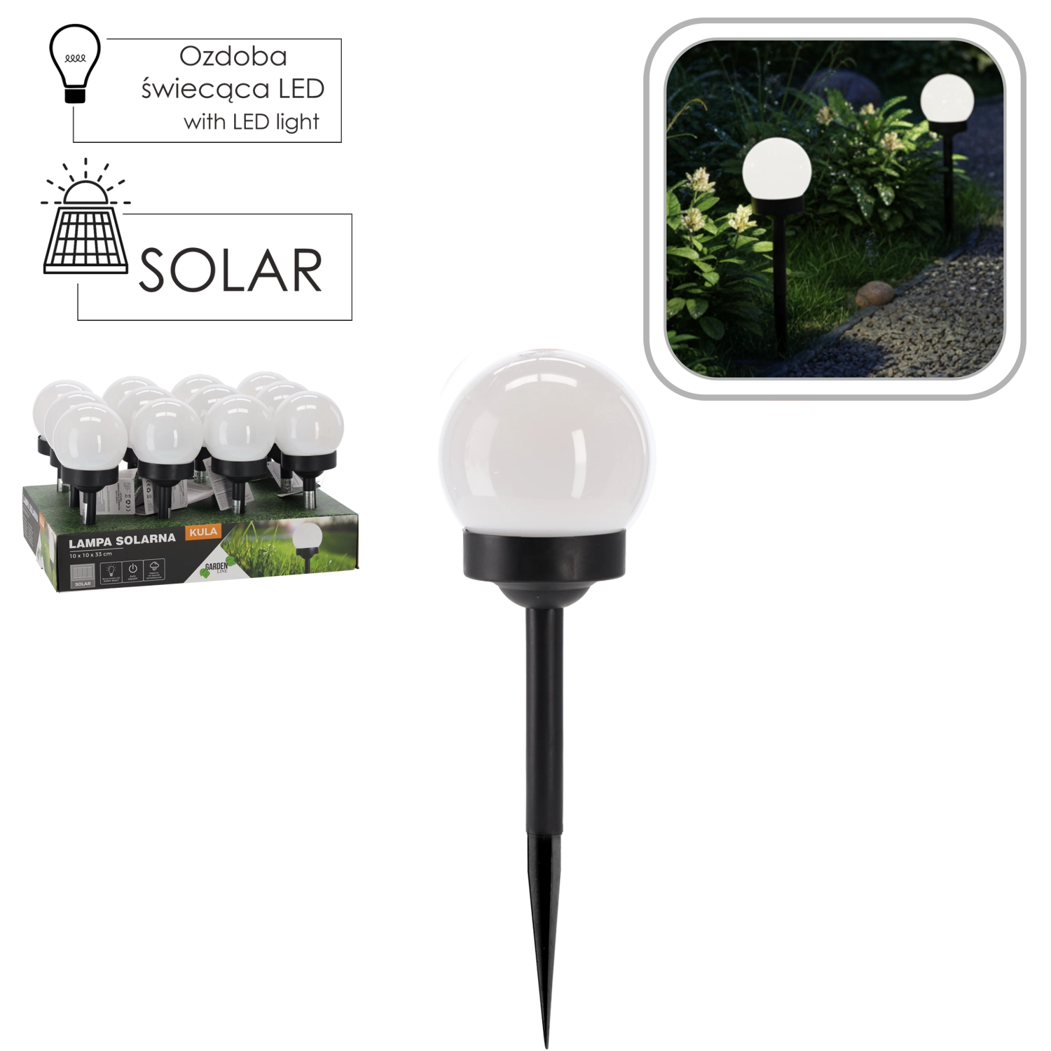 Stílusos napelemes LED lámpa gömb formában, ideális kerti ösvények, teraszok és behajtók megvilágítására. Napenergiával működik, így nincs szükség kábelekre vagy további költségekre. A automatikus töltésnek és az IP44 védelemnek köszönhetően megbízhatóan világít minden időjárásban, és könnyen telepíthető a földbe szúrható tüske segítségével.