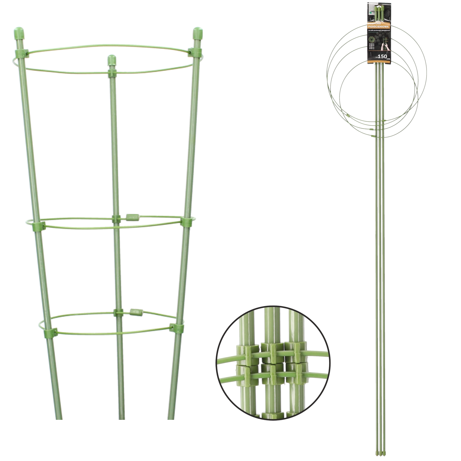 Praktikus, 150 cm magas, PE bevonatú, tartós acélból készült kör alakú növénytámasz kerti és szobanövényekhez. Biztosítja a stabil támaszt, megelőzi a növények megdőlését, és támogatja a harmonikus növekedést. A zöld színnek köszönhetően a lomb között szinte láthatatlan, és kiválóan alkalmas áfonyákhoz, hortenziákhoz, valamint más cserjékhez és évelőkhöz.