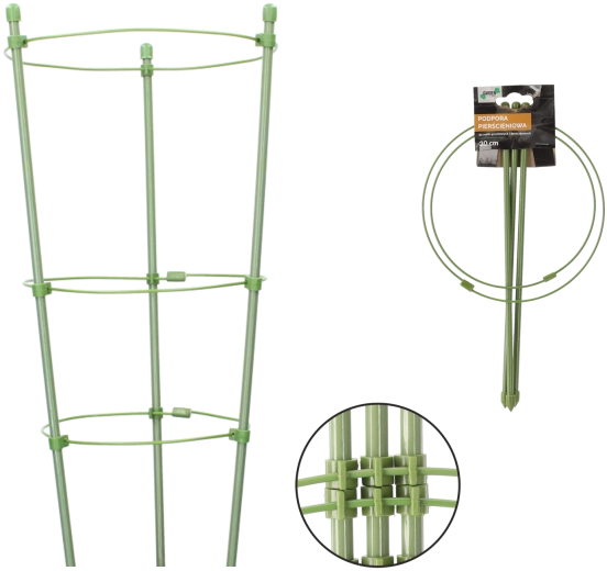 Ez a két gyűrűs kör támasz megbízható megoldás a növények egyenes növekedésének fenntartására cserepekben és ágyásokban egyaránt. A polietilénnel bevont acél szerkezetnek köszönhetően rendkívül ellenálló az időjárási hatásokkal és a mechanikai sérülésekkel szemben. Zöld kivitele beleolvad a lombba, így szinte láthatatlan marad.