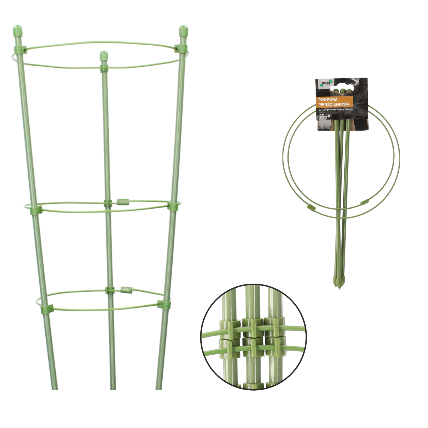 Praktikus, két gyűrűs, polietilénnel bevont, tartós acélból készült kör alakú növénytámasz, amely biztosítja a stabil növekedést, a törés elleni védelmet és a diszkrét beilleszkedést a zöld környezetbe a zöld színének köszönhetően. Ideális cserepekhez és ágyásokhoz, kiválóan alkalmas áfonyához és hortenziához.