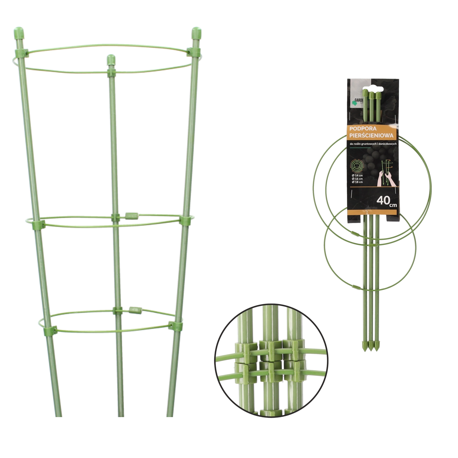 Ez a három gyűrűs kör alakú támasz kiváló megoldás szobanövényekhez, kerti ágyásokhoz és kisebb cserjékhez. A masszív, polietilén bevonatú acél ellenáll az időjárásnak és a mechanikai kopásnak, miközben a zöld kivitel az ágyásban szinte észrevétlen marad.