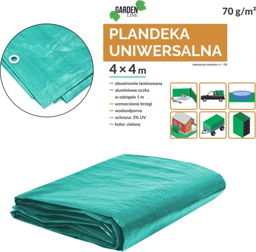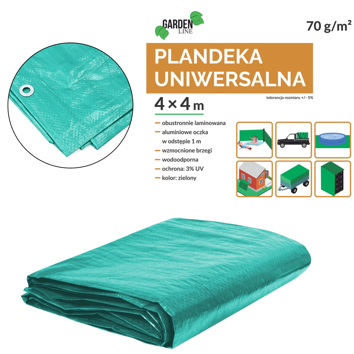 Univerzális, kiváló minőségű PE takaróponyva 70 g/m² felülettömeggel, amely véd az esőtől, portól és napsütéstől. Kétoldalas laminálású, megerősített, zsinórral erősített szegéllyel és alumínium ringlikkel 1 m-enként. Zöld színben, UV-védelem 3%, méret 4 × 4 m (+/−5%).