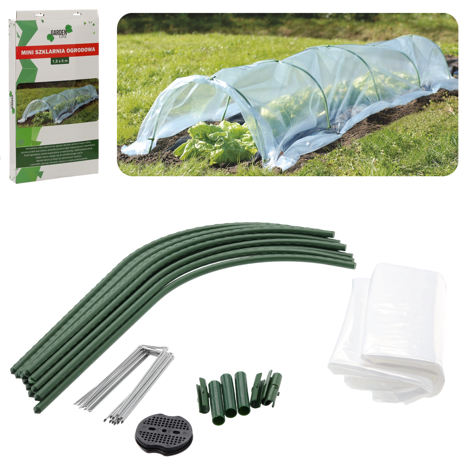 A csomag tartalmazza az íveket, csatlakozókat, földbe szúrható tüskéket és klipszeket a fólia stabil rögzítéséhez. Az alagút szezon után gyorsan szétszedhető és tárolható – minimális helyigénnyel.