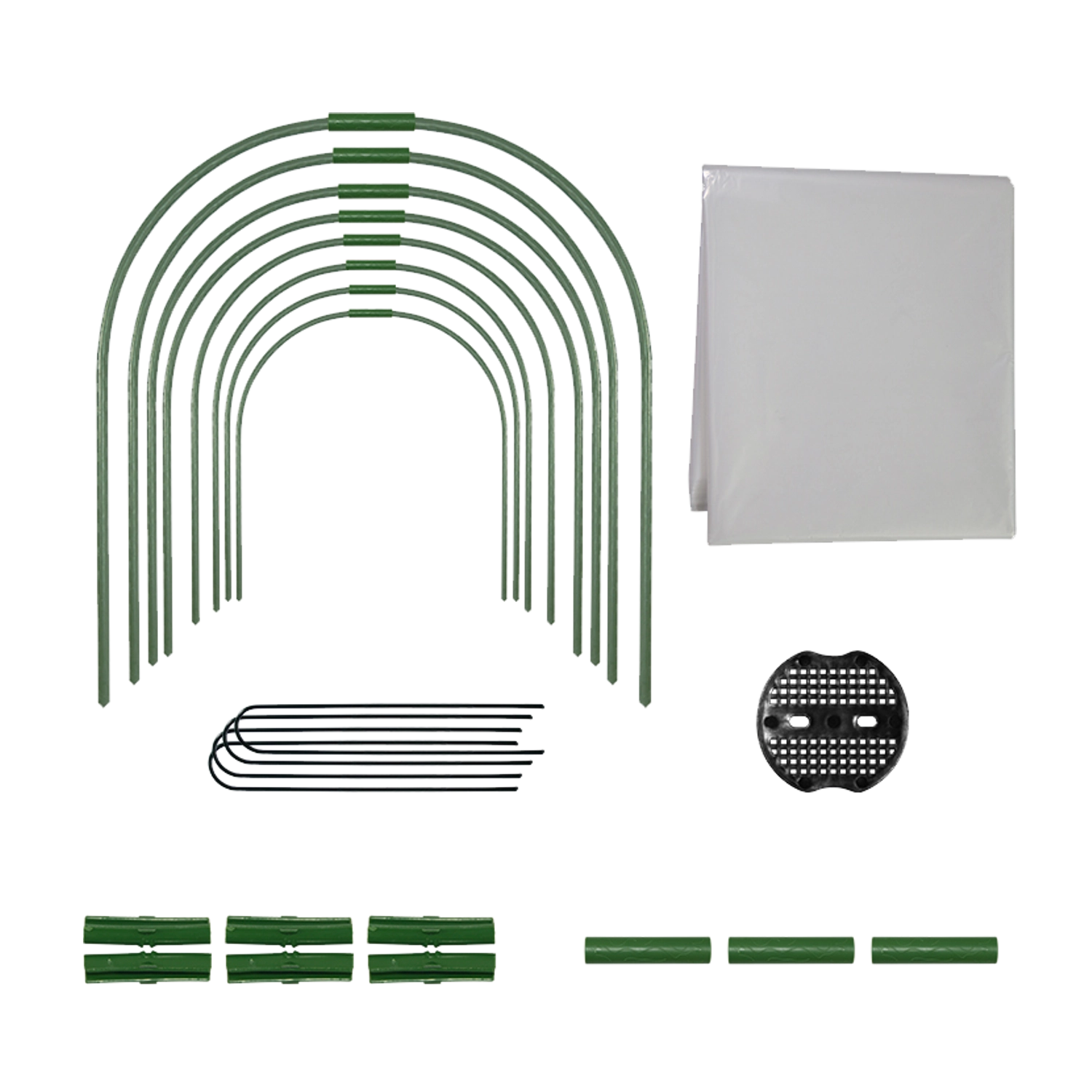 A műanyag bevonatú acél ívek tartják a formát, és jól ellenállnak az időjárásnak. A klipszek és földbe szúrható tüskék szilárdan rögzítik a fóliát a talajhoz.