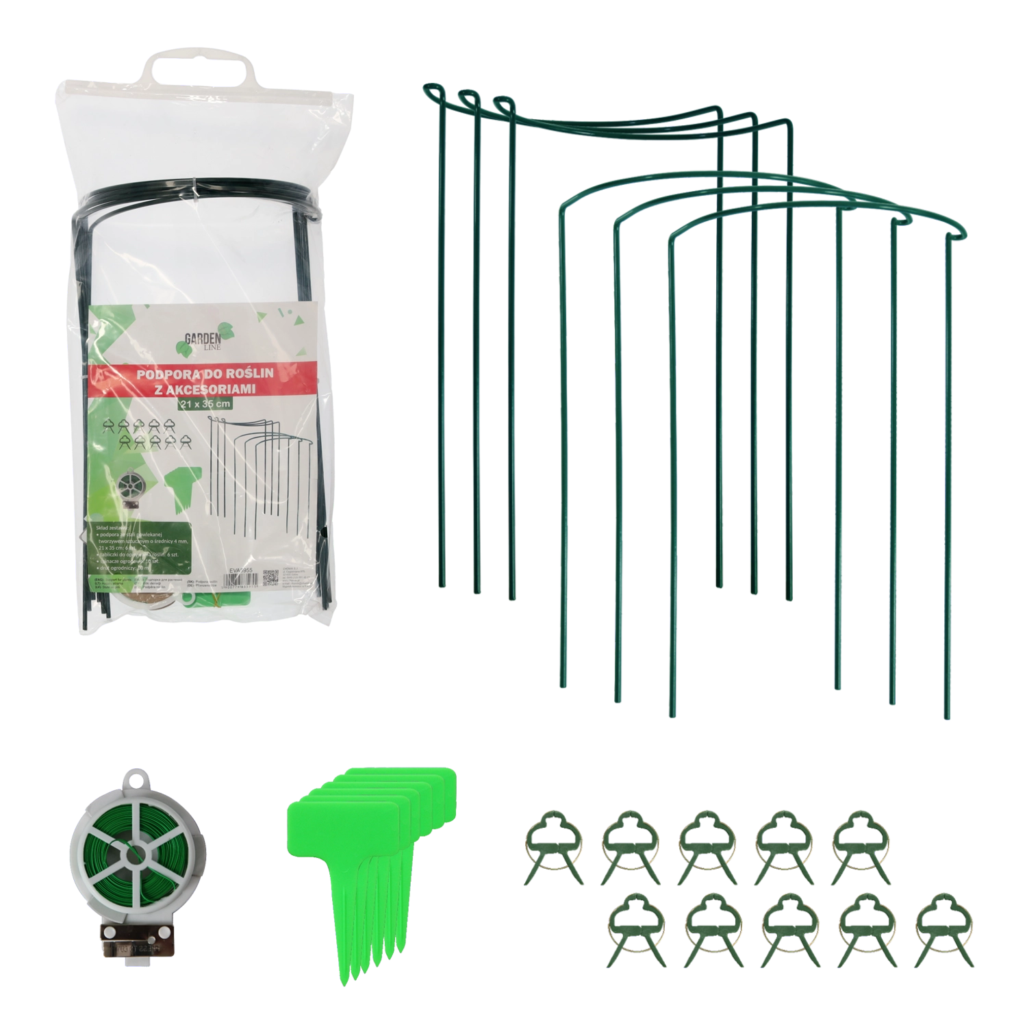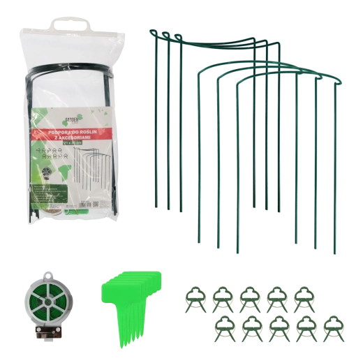 Praktikus kerti támasz virágokhoz és dísznövényekhez, erős acélból műanyag bevonattal. Zöld színe miatt észrevétlen, egyúttal stabilizálja a szárakat és támogatja a harmonikus növekedést. A csomag teljes tartozékkészletet tartalmaz a könnyű rögzítéshez és a növények jelöléséhez.