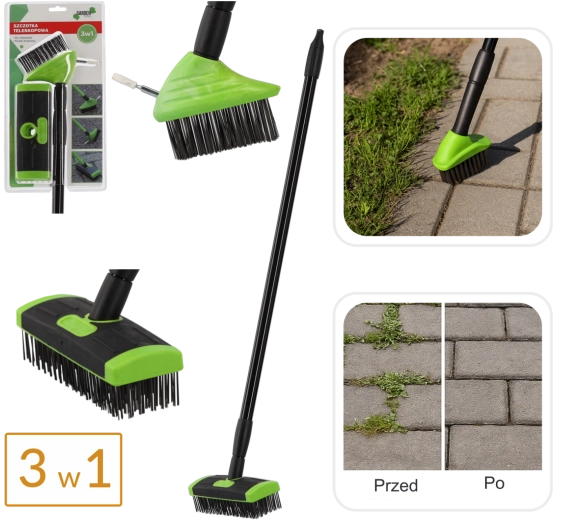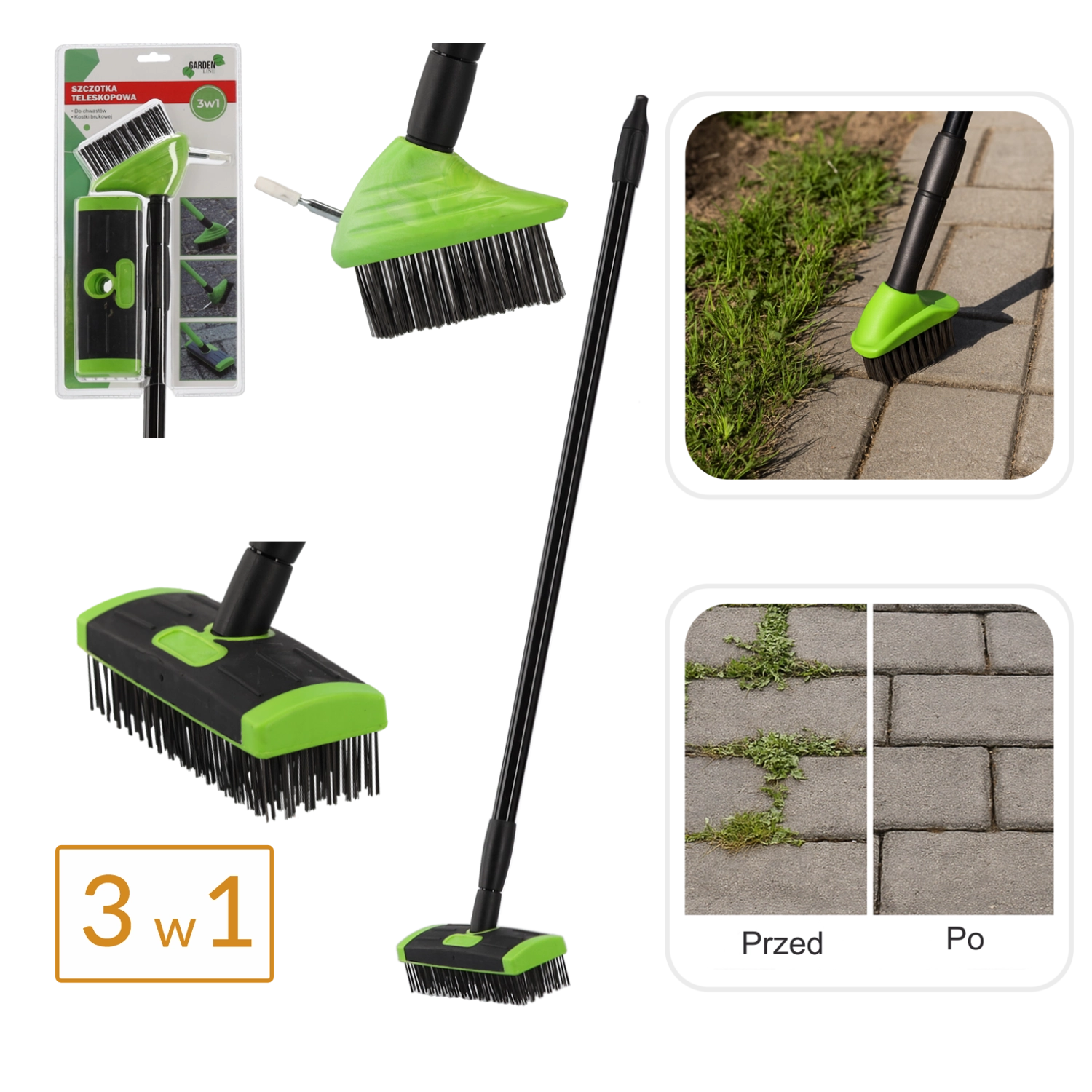 Az praktikus 3 az 1-ben készlet három nagy teljesítményű fejet kombinál a kültéri felületek alapos tisztításához. A merev, sárgaréz bevonatú drótsörték vegyszerek nélkül is megbirkóznak a szennyeződésekkel, a mohával és a gyommal, míg a könnyű és erős teleszkópos rúd kényelmes, álló helyzetű munkát tesz lehetővé. Ideális térkőhöz, szegélykövekhez, udvarokhoz és teraszokhoz.