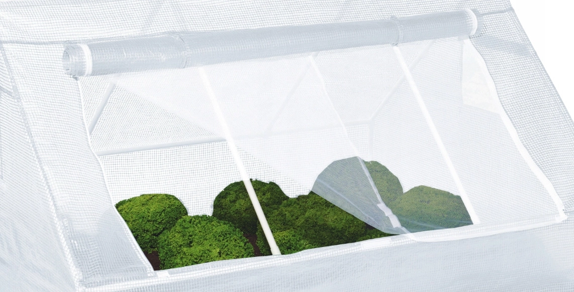 A feltekerhető, szúnyoghálós ablakok és az elülső, cipzáras roló optimális légáramlást és kényelmes növényápolást biztosítanak.