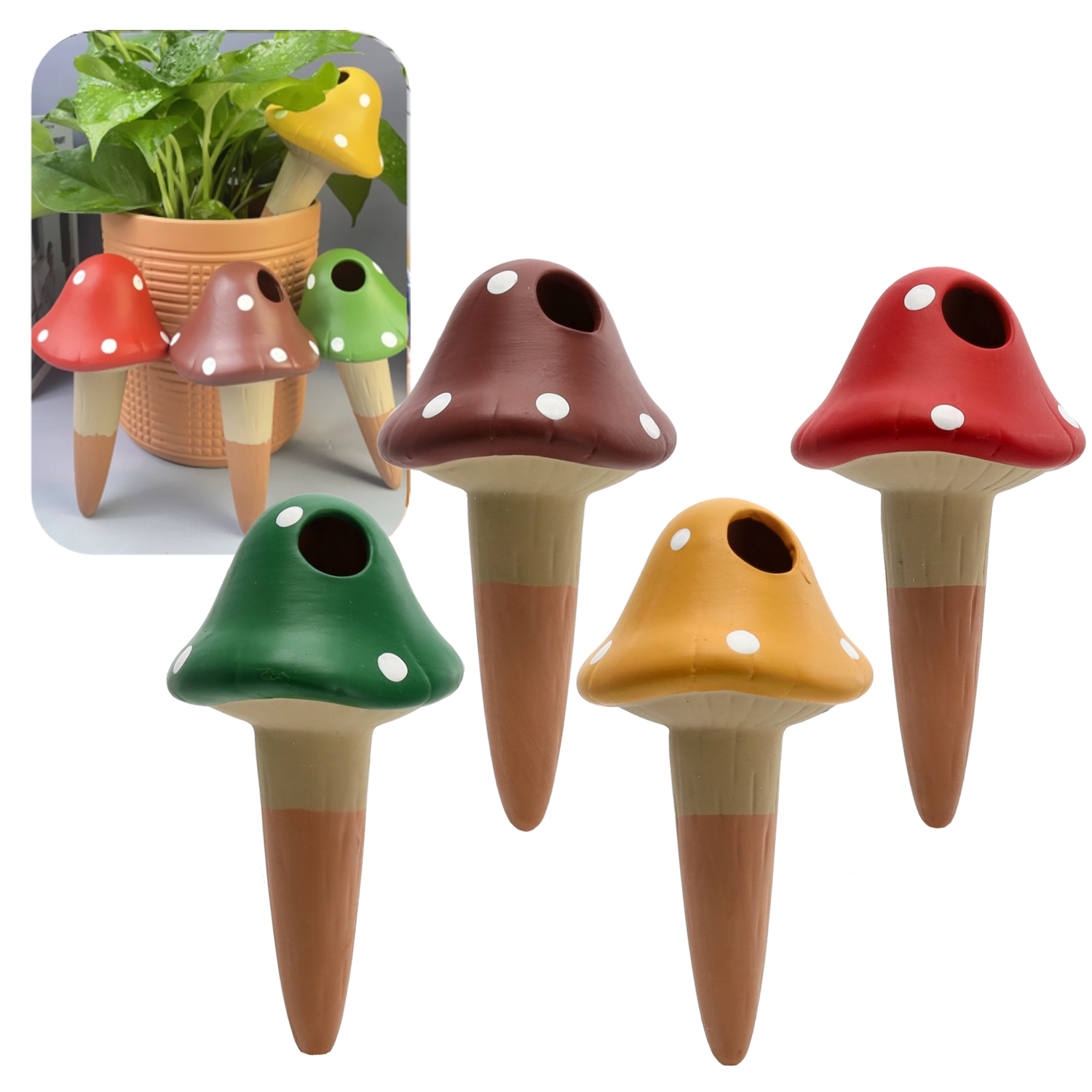 Remekül működik cserepekben, ládákban és függő edényekben is. A pöttyös kalappal díszített, dekoratív kialakítás játékos megjelenést ad növényeinek, miközben teljesen funkcionális marad. Vegyes színekben (zöld, piros, barna, sárga) elérhető, így könnyen összehangolhatja az enteriőrrel vagy a szezonális dekorral.