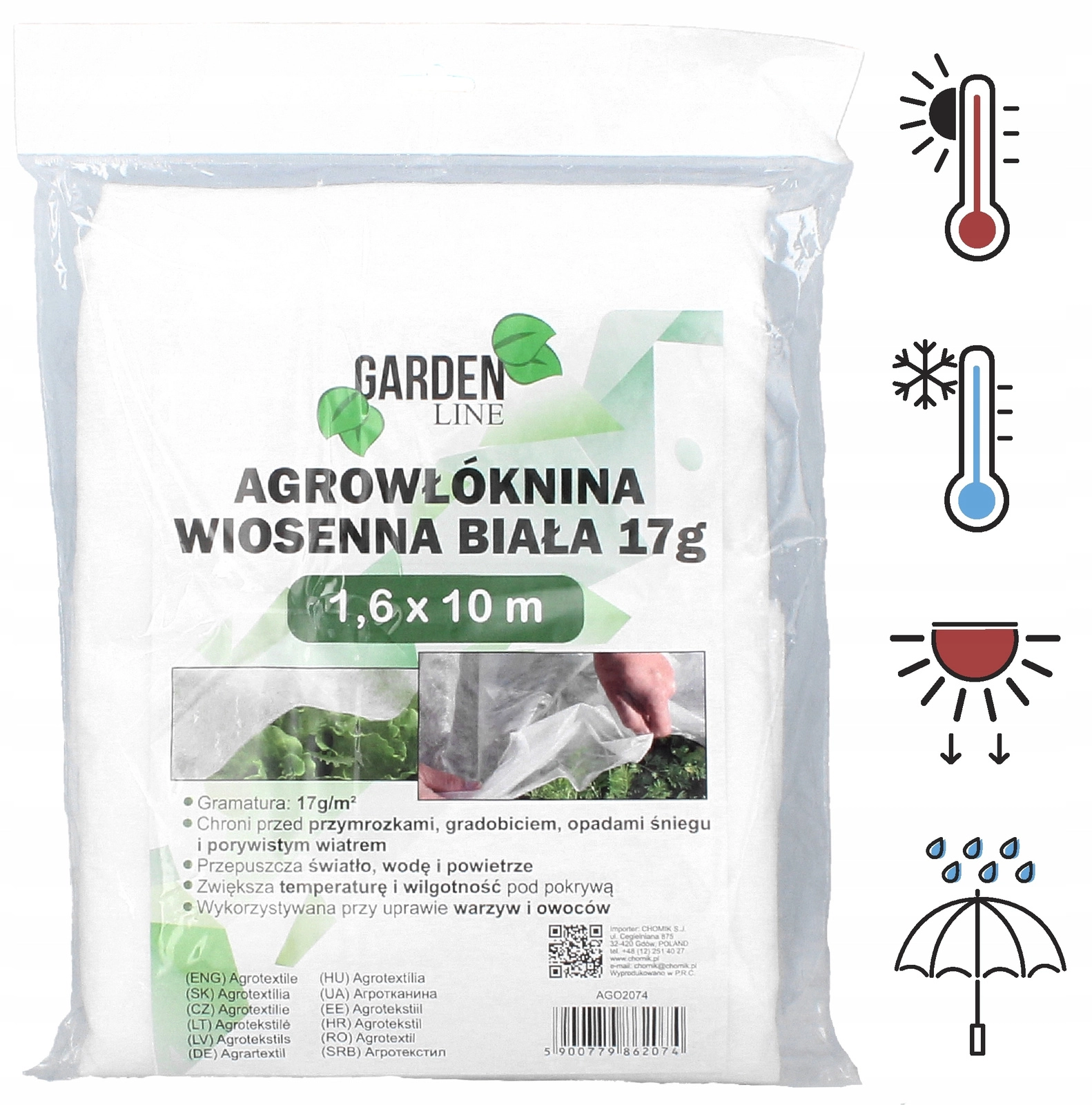 A 1,6 × 10 m méretű könnyű tavaszi agrotextília megvédi a fiatal növényeket a hidegtől, széltől és csapadéktól, miközben ideális mikroklímát biztosít. Az anyag átengedi a fényt, a vizet és a levegőt, ezáltal támogatja az egészséges növekedést, a takarás alatt pedig segít magasabb hőmérsékletet és páratartalmat fenntartani. A fehér szín visszaveri a napfényt, a textília pedig UV-álló a hosszabb élettartam érdekében.