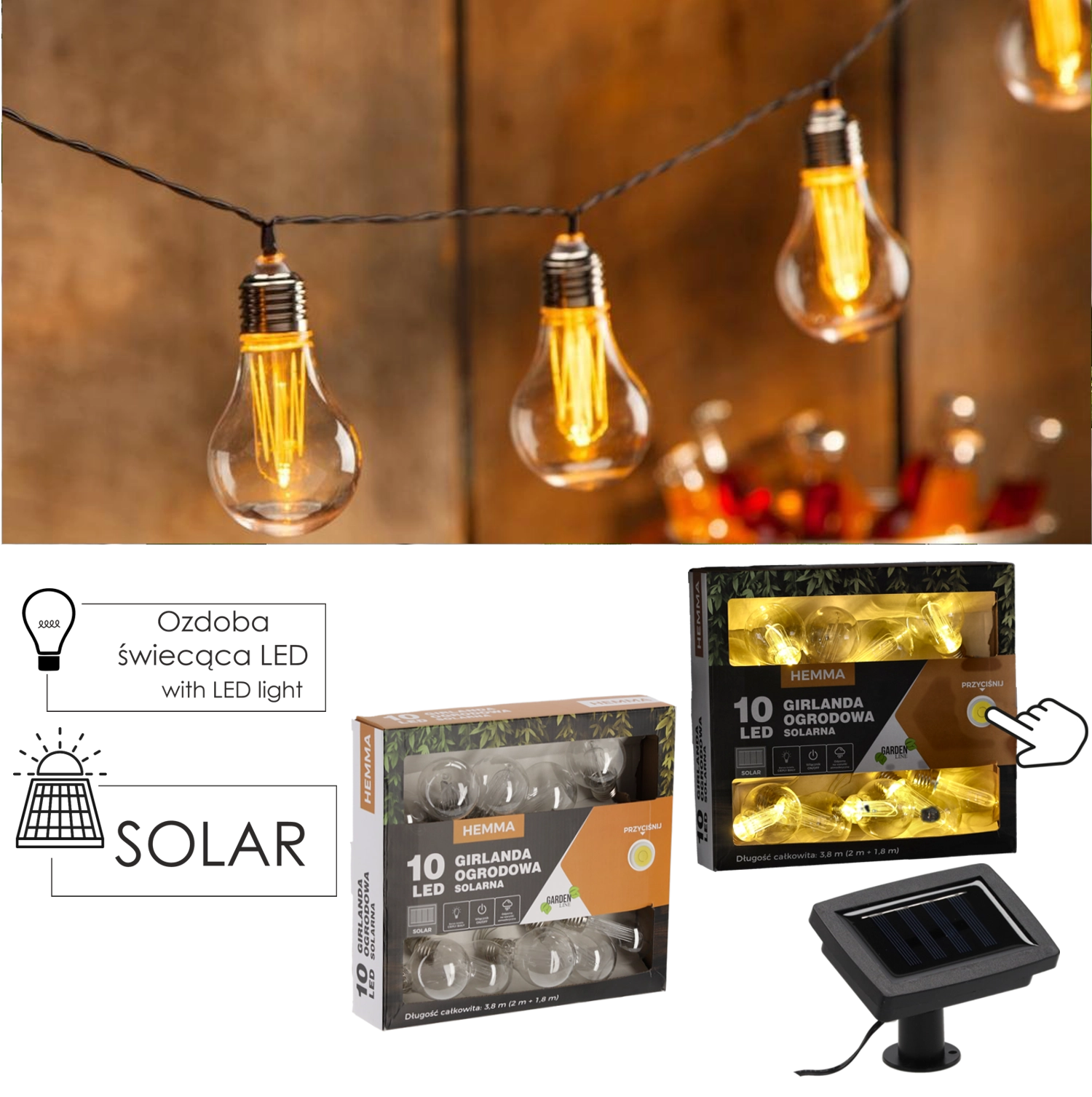 Tíz nagy izzó meleg fényű LED-del kellemes, hangulatos megvilágítást nyújt pihenéshez és baráti beszélgetésekhez.