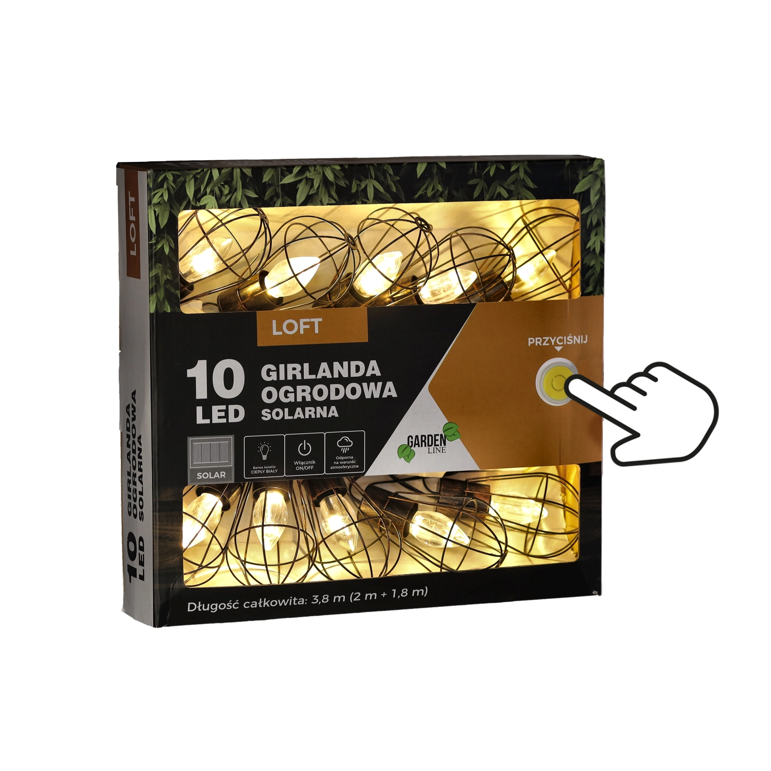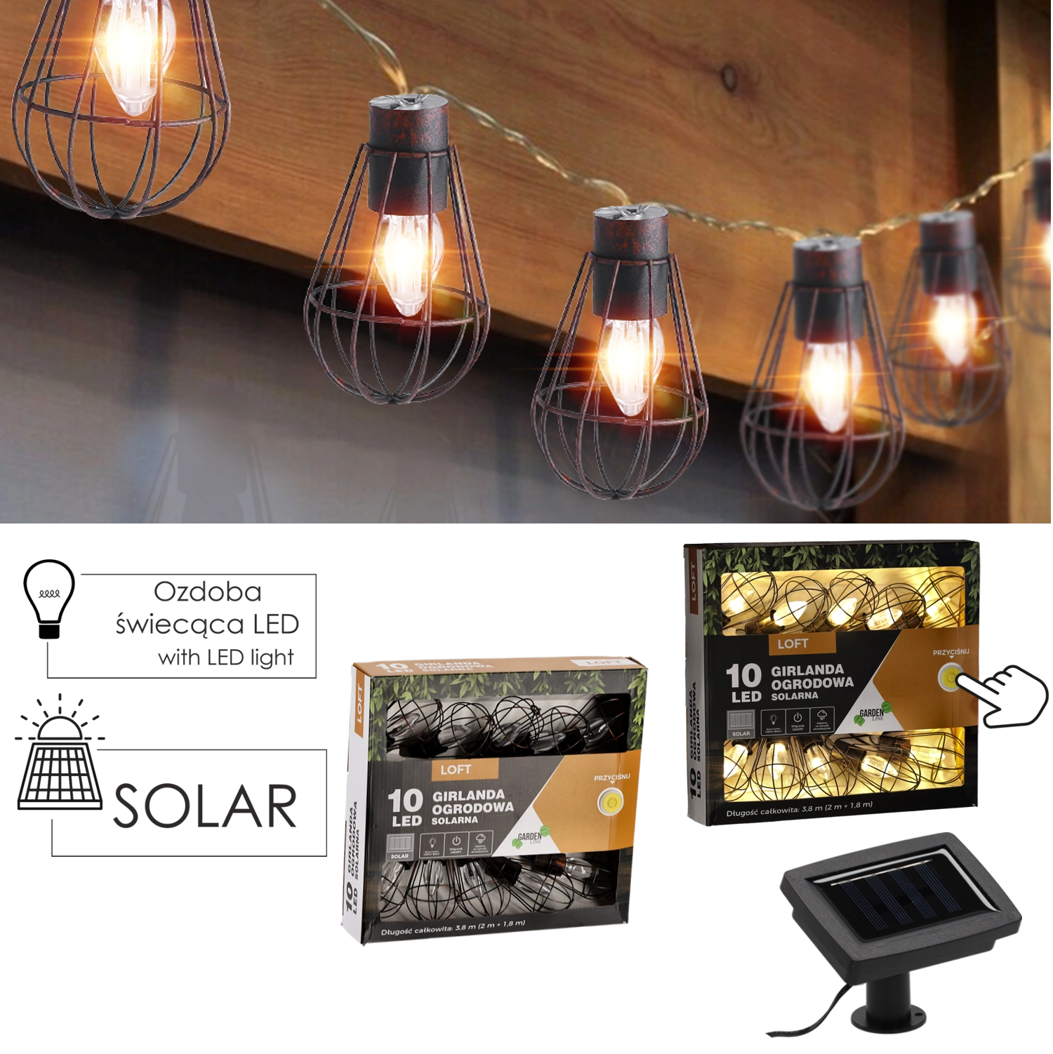 Varázslatos hangulatot ad erkélynek, terasznak és kertnek az ipari loft stílusú napelemes girland. A 10 LED meleg fehér fénnyel töltés után akár 6–7 órán át világít, a tápellátást napelem panel beépített akkumulátorral biztosítja, és a IP44 védettségnek köszönhetően ellenáll az esőnek és a párának. A praktikus 3,8 m hossz (2 m betápkábel + 1,8 m fényfüzér) és a 20 cm-es távolságok az égők között egyenletes, otthonos megvilágítást biztosítanak konnektor nélkül.