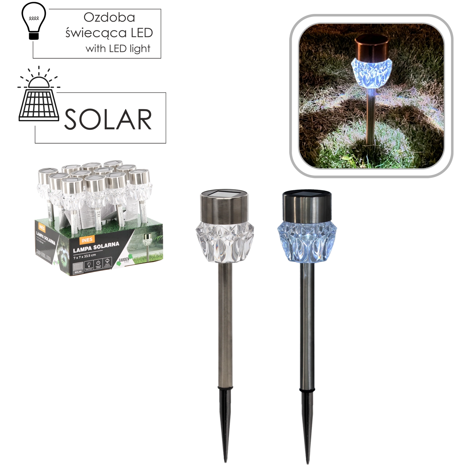 Az INES napelemes lámpa stílusos és takarékos megoldás a kert és a ház környezetének megvilágítására. A beépített amorf napelem panel nappal feltölti az akkumulátort, estére a fény automatikusan felkapcsol, és fényes, hideg fehér hatást kelt, ami ideális a gyalogutak és felhajtók mentén való tájékozódáshoz.