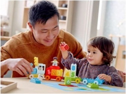 A színes LEGO DUPLO Számvonat szett játékos utat kínál a számoláshoz 18 hónapos kortól. Tartalmaz egy tolható vonatot, 10 számos kockát, valamint egy kislány, egy kisfiú és egy kutyus figurát a szórakoztató számok tanulásához, a finommotorika fejlesztéséhez és a kreatív játékhoz.