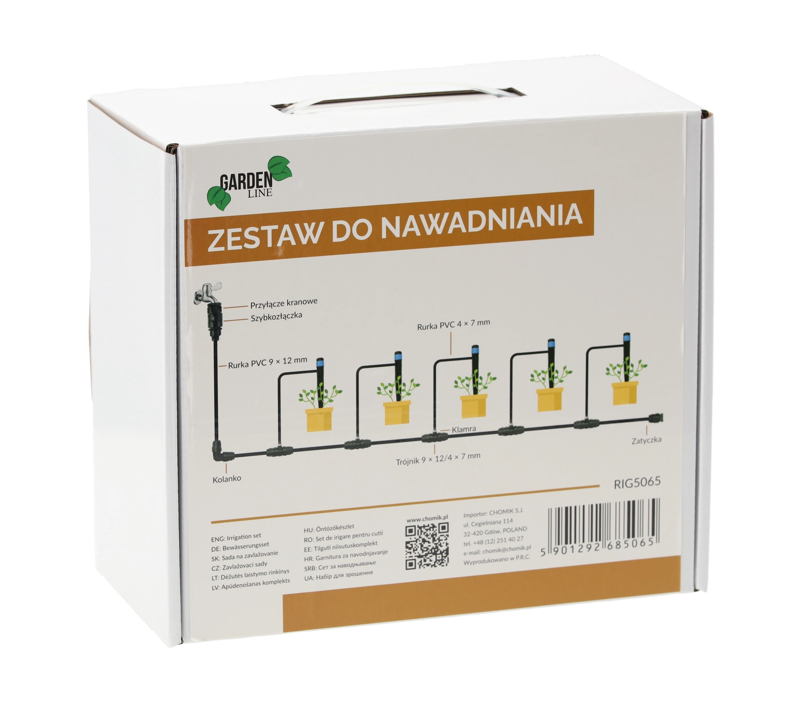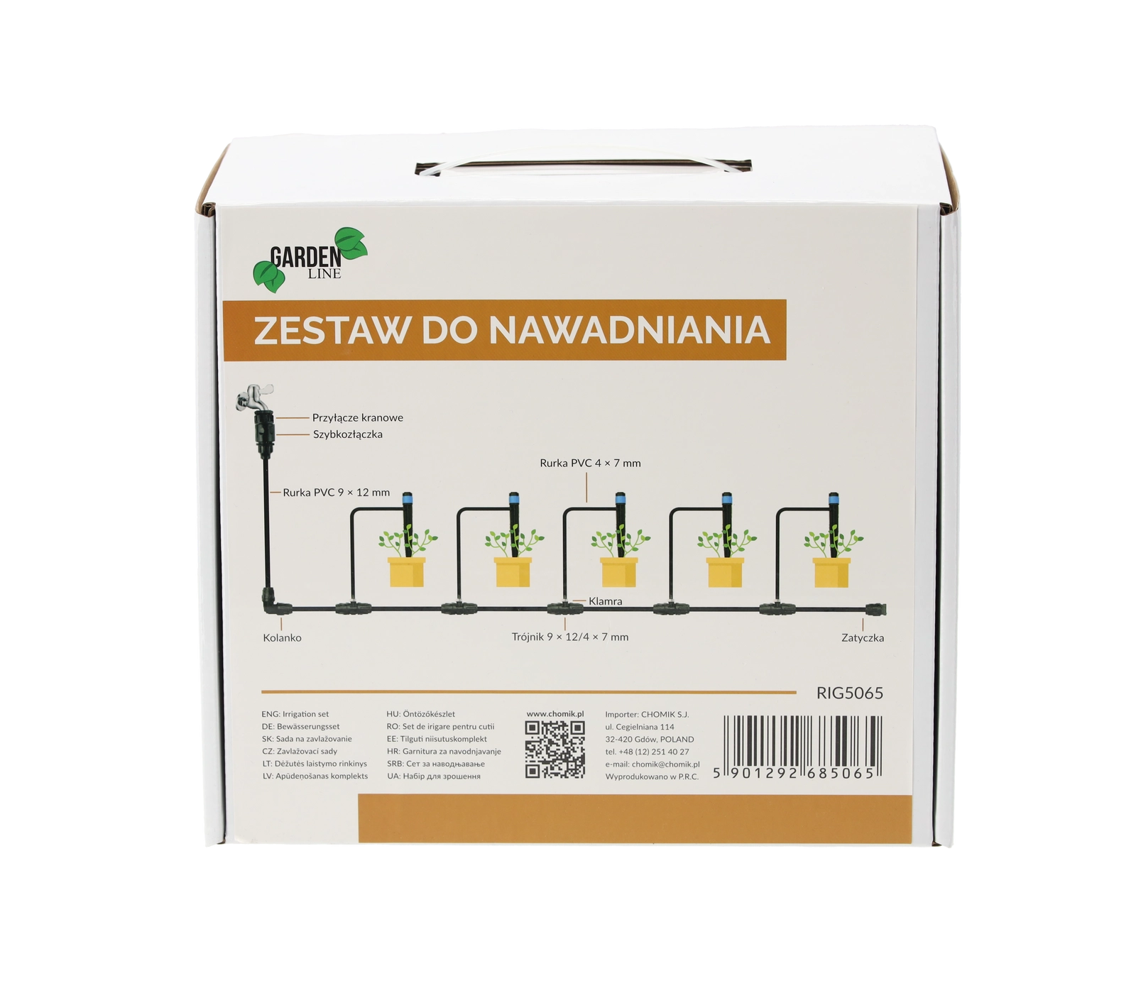 Minden egy dobozban: csepegtetők, tömlők, csatlakozók, T-idomok, végzárók és PTFE szalag. Pillanatok alatt összeállítható és beüzemelhető.