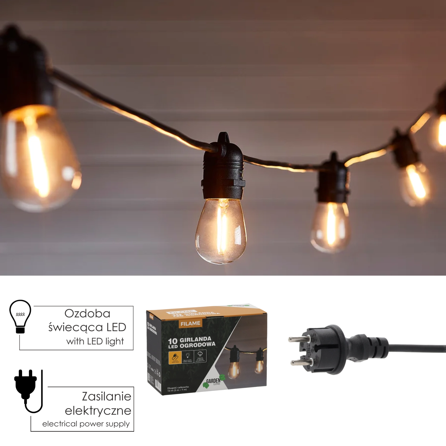 Varázsoljon hangulatos légkört a kertben, teraszon vagy erkélyen a FILAME fényfüzérrel, 10 db E27 LED izzóval, amelyek meleg fehér, 3000 K fényt adnak. IP44 kültéri védelem, összhossz 10 m (3 + 7 m), alacsony fogyasztás (1 W/izzó) és akár 120 készlet összekapcsolhatósága – ideális dekorvilágítás minden alkalomra.