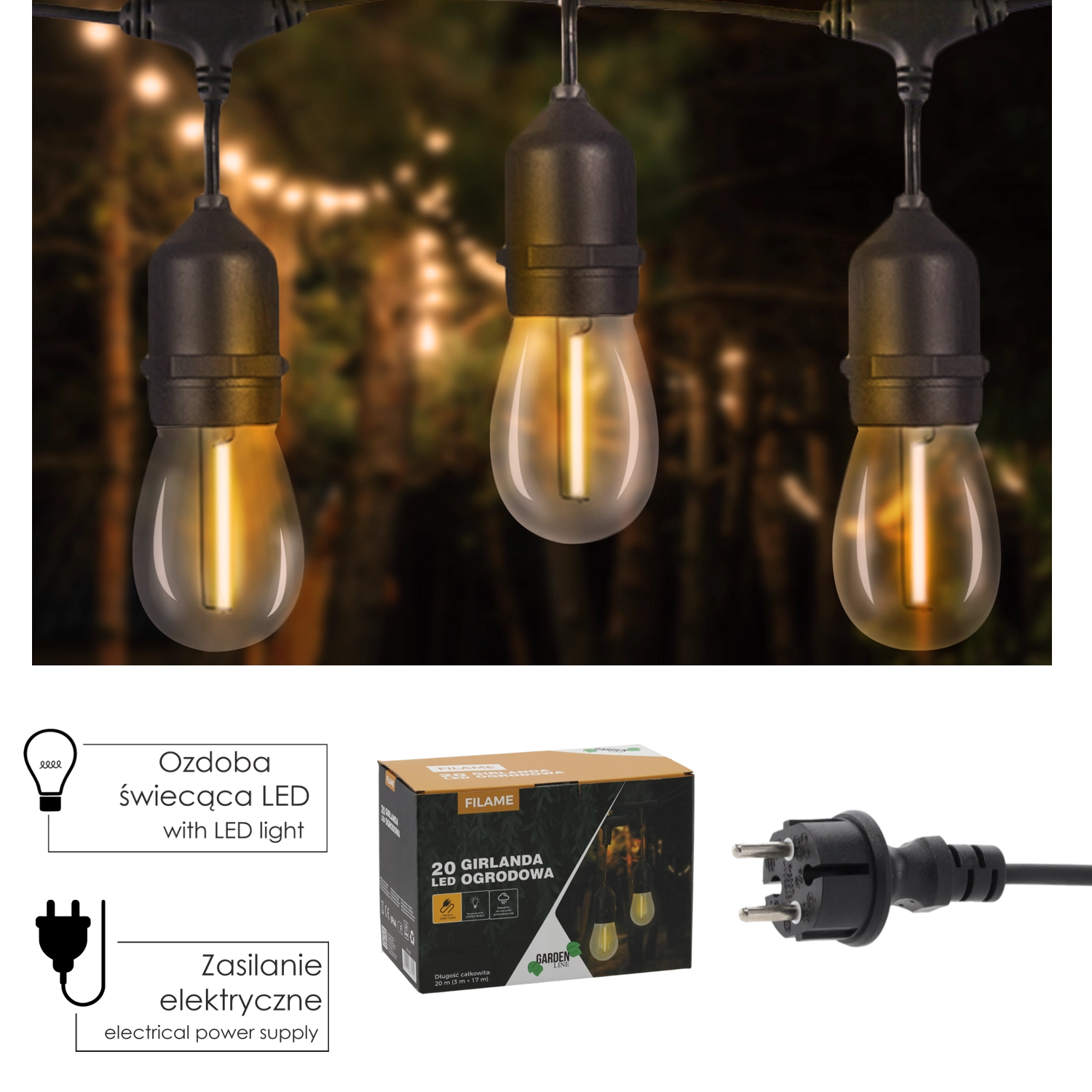 A telepítés egyszerű és biztonságos. A füzér praktikus tápkábellel és foglalatoknál kialakított rögzítési pontokkal ellátott fénylánc szakasszal rendelkezik, így könnyedén rögzítheti pergola alá, korlát mentén vagy a fák koronájába.