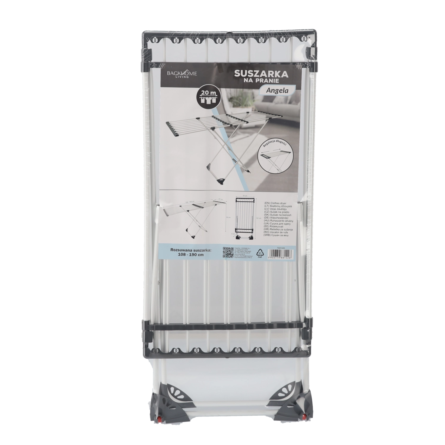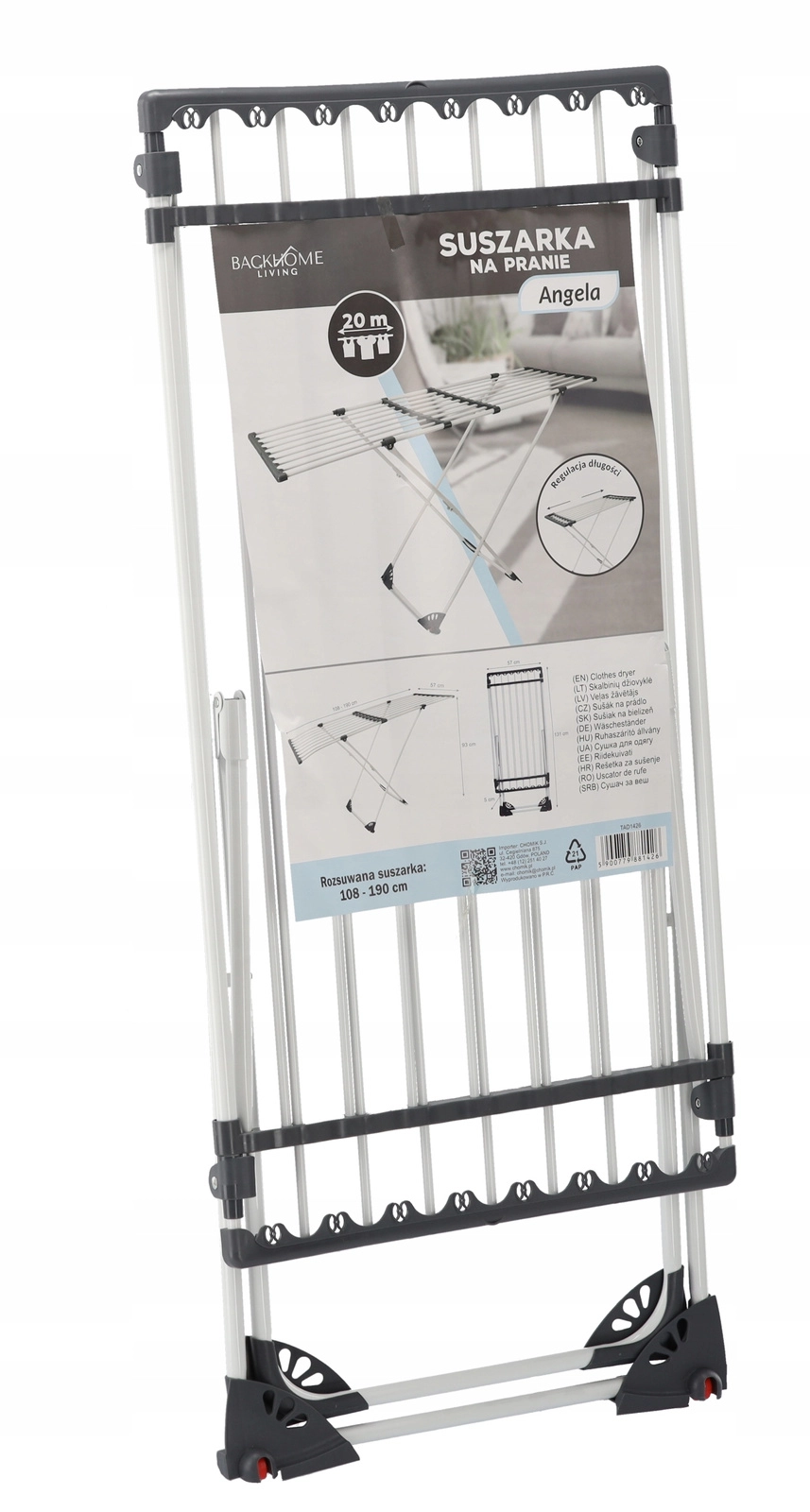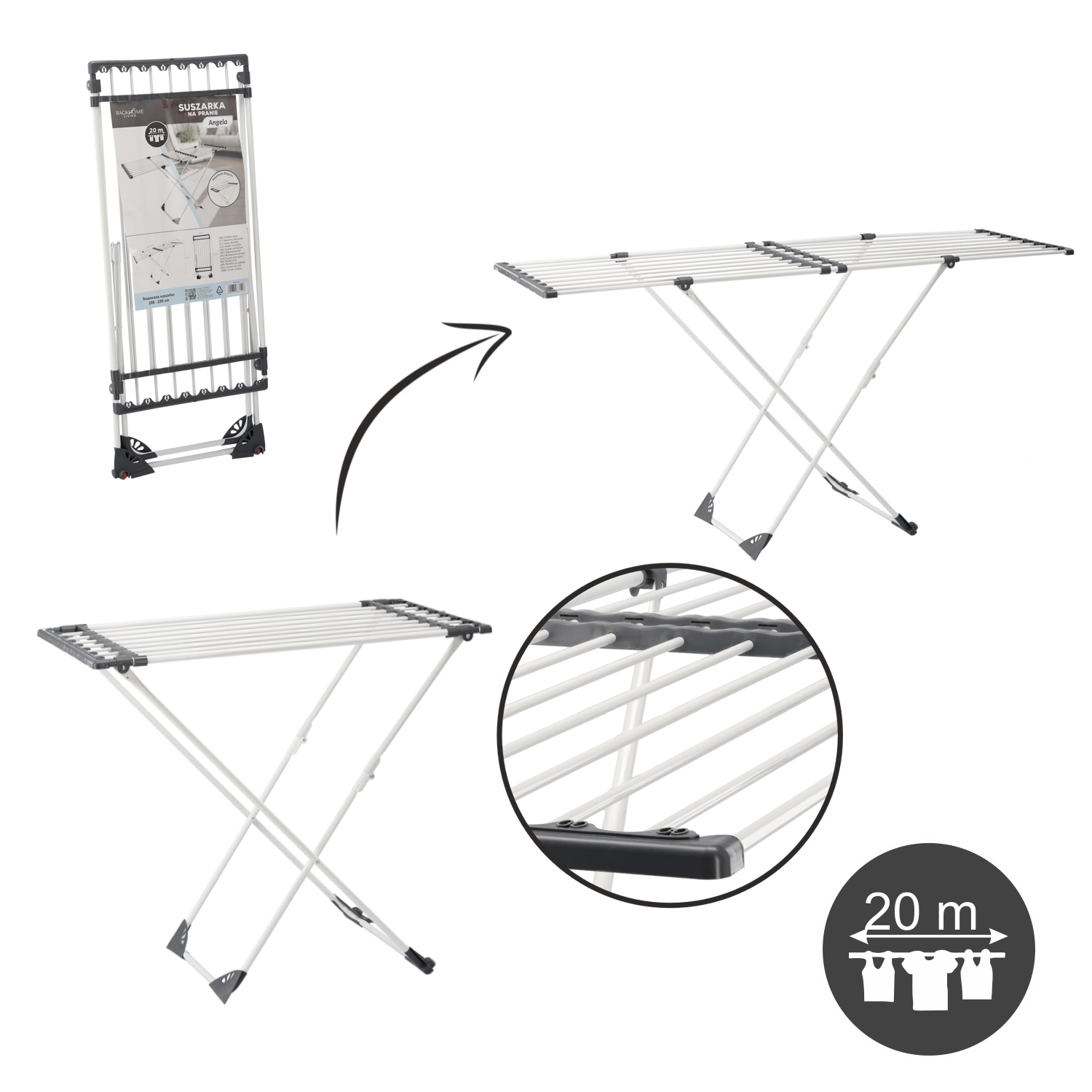 A praktikus Angela ruhaszárító minden háztartásba ideális. 108–190 cm között állítható hosszúságot, kihajtható oldalsó szárnyakat a nagyobb kapacitásért és stabil, korrózióálló szerkezetet kínál a hosszú élettartam érdekében. Összecsukva kompakt, és könnyen tárolható.