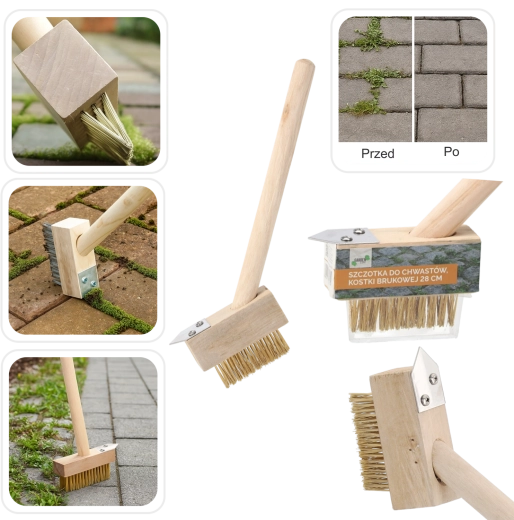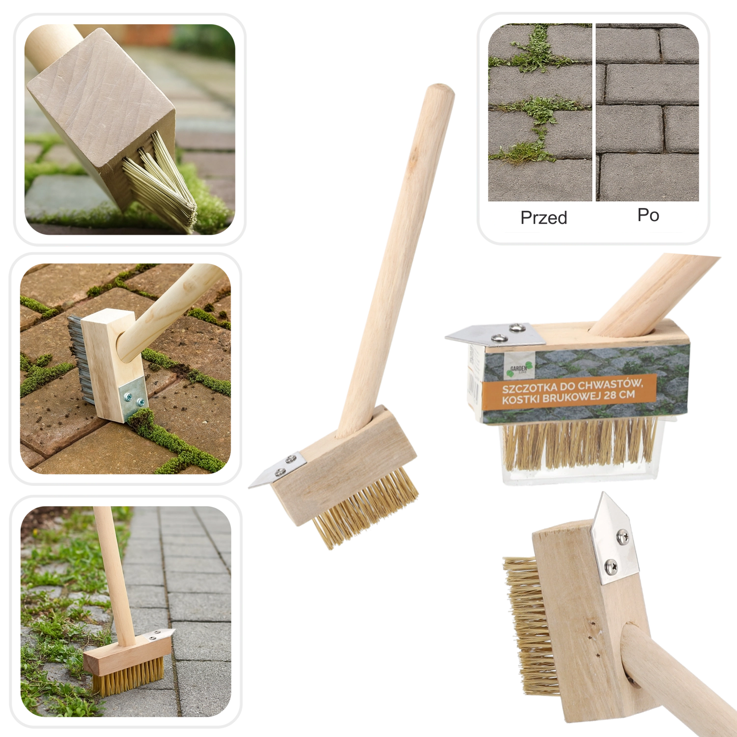 A kompakt és tartós, 28 cm hosszú gyom- és fugatisztító kefe hatékonyan tisztítja a hézagokat a térkövek és járólapok között. A erős fém sörtéket kaparó acéléllel kombinálja a moha, fű és benőtt szennyeződések eltávolításához. Az ergonomikus fa nyélnek köszönhetően kényelmes a használata, és megkönnyíti a teraszok, járdák és felhajtók rendszeres karbantartását.