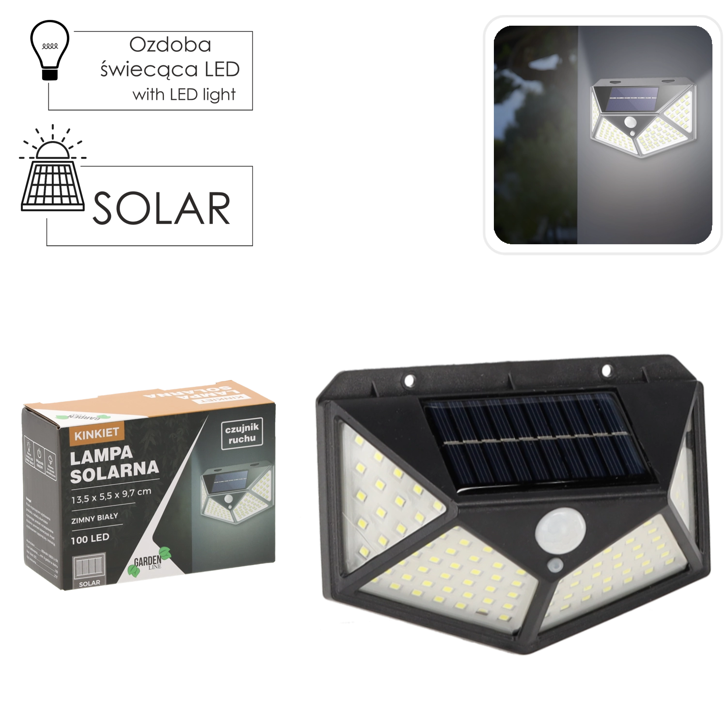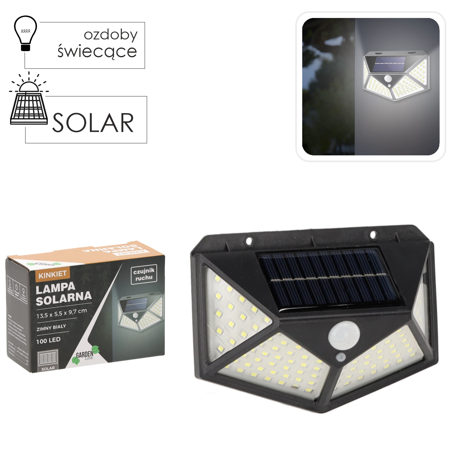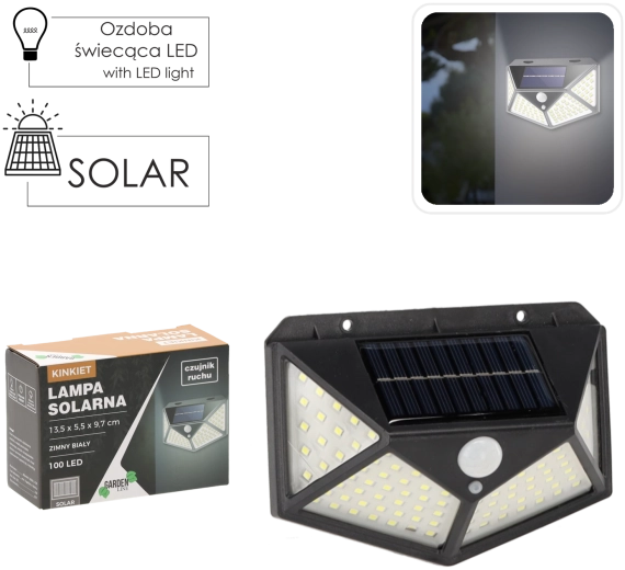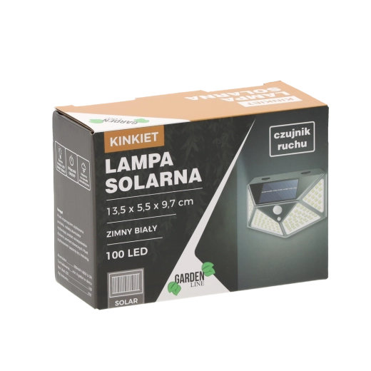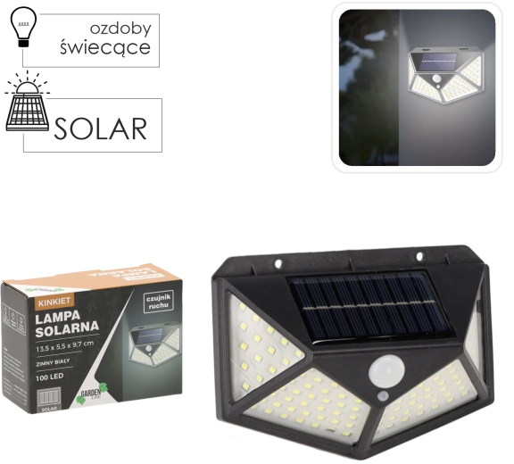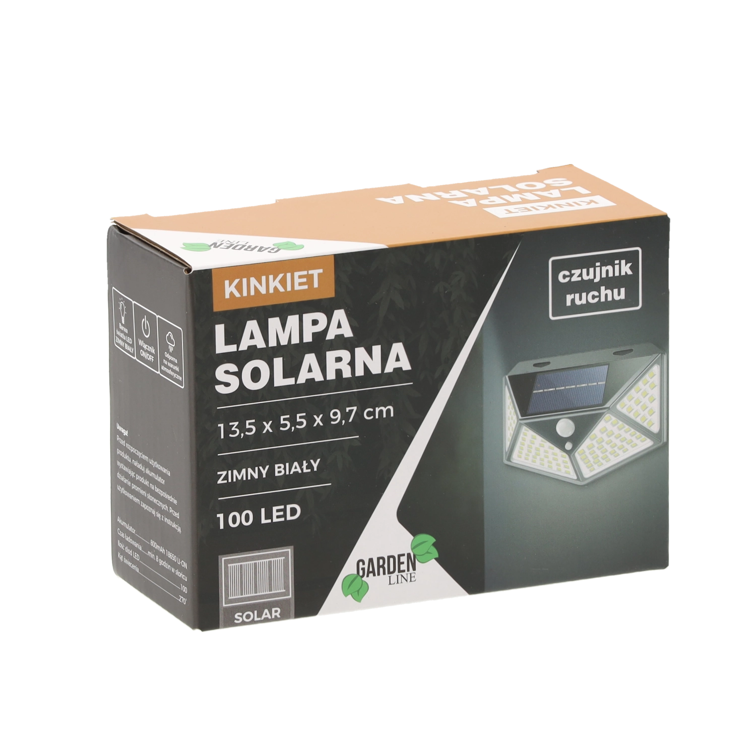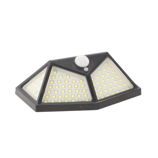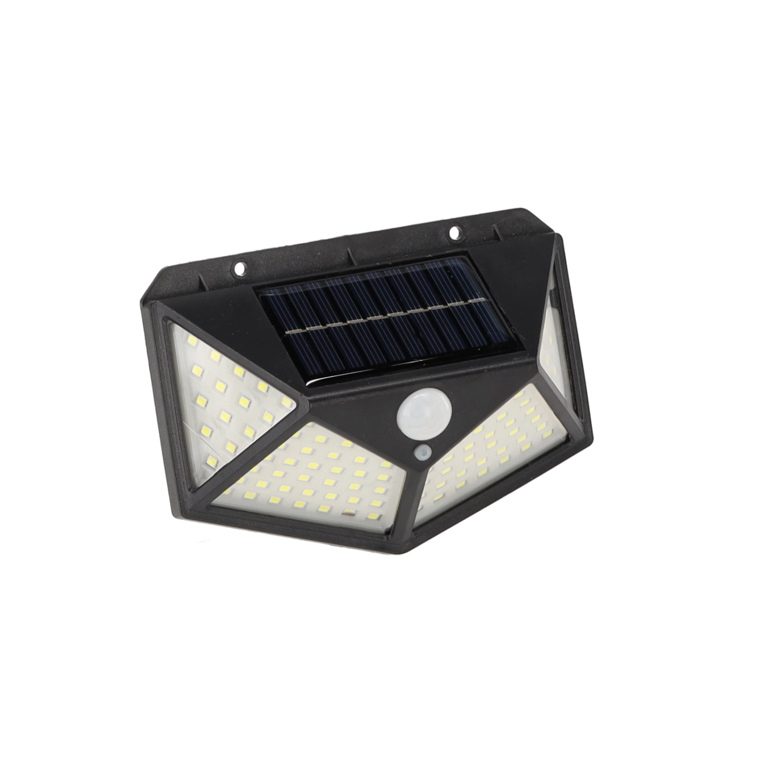 Kompakt napelemes fali lámpa 100 LED-del és PIR mozgásérzékelővel, amely erős, hideg fehér fényt biztosít ott, ahol szükség van rá. A napelemes tápellátásnak és a mozgás észlelésekor történő automatikus bekapcsolásnak köszönhetően ideális bejáratokhoz, járdákhoz és teraszokhoz, és energiát takarít meg kábelezés nélkül.