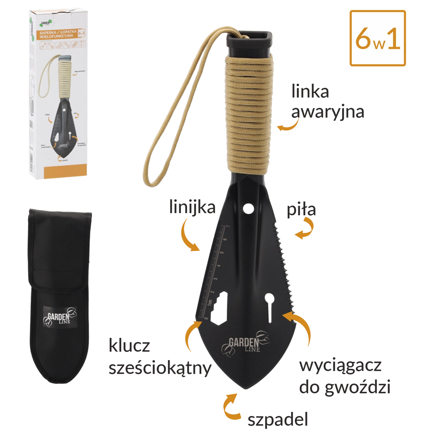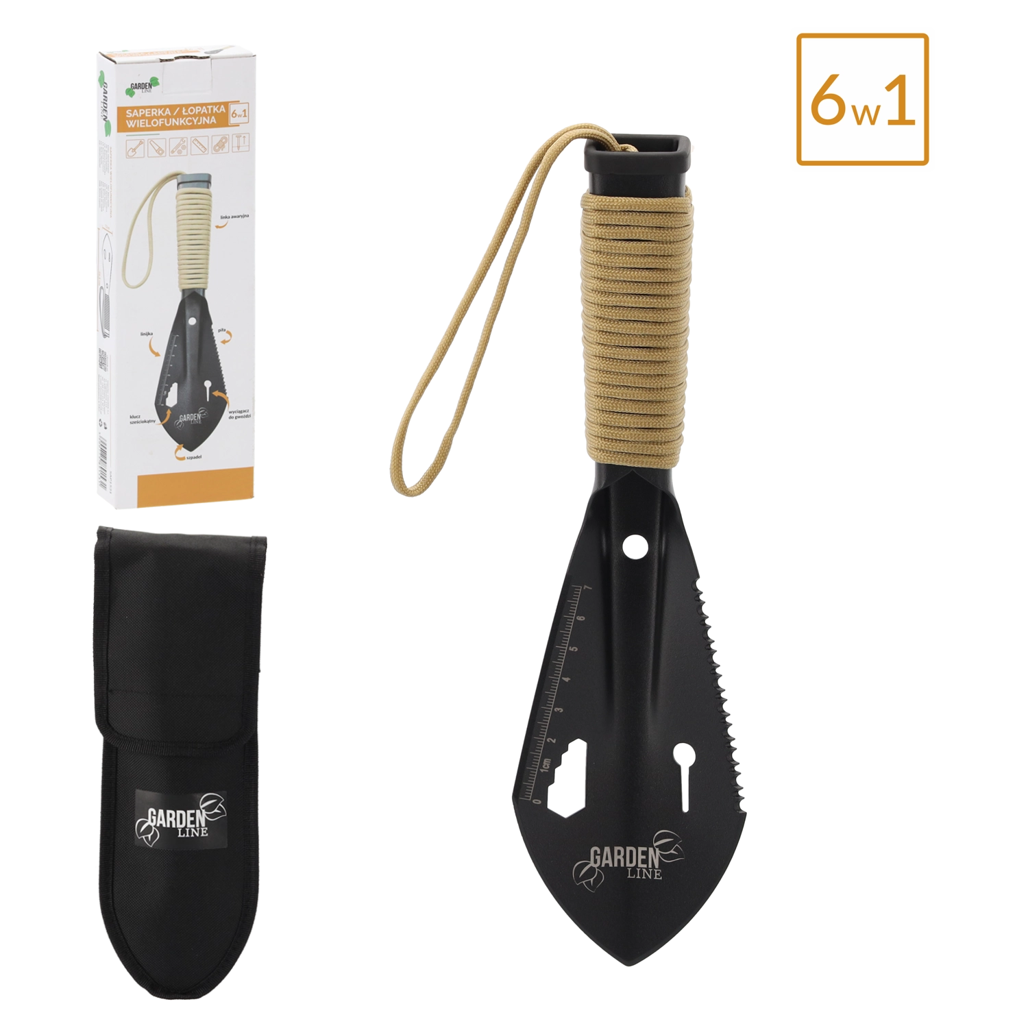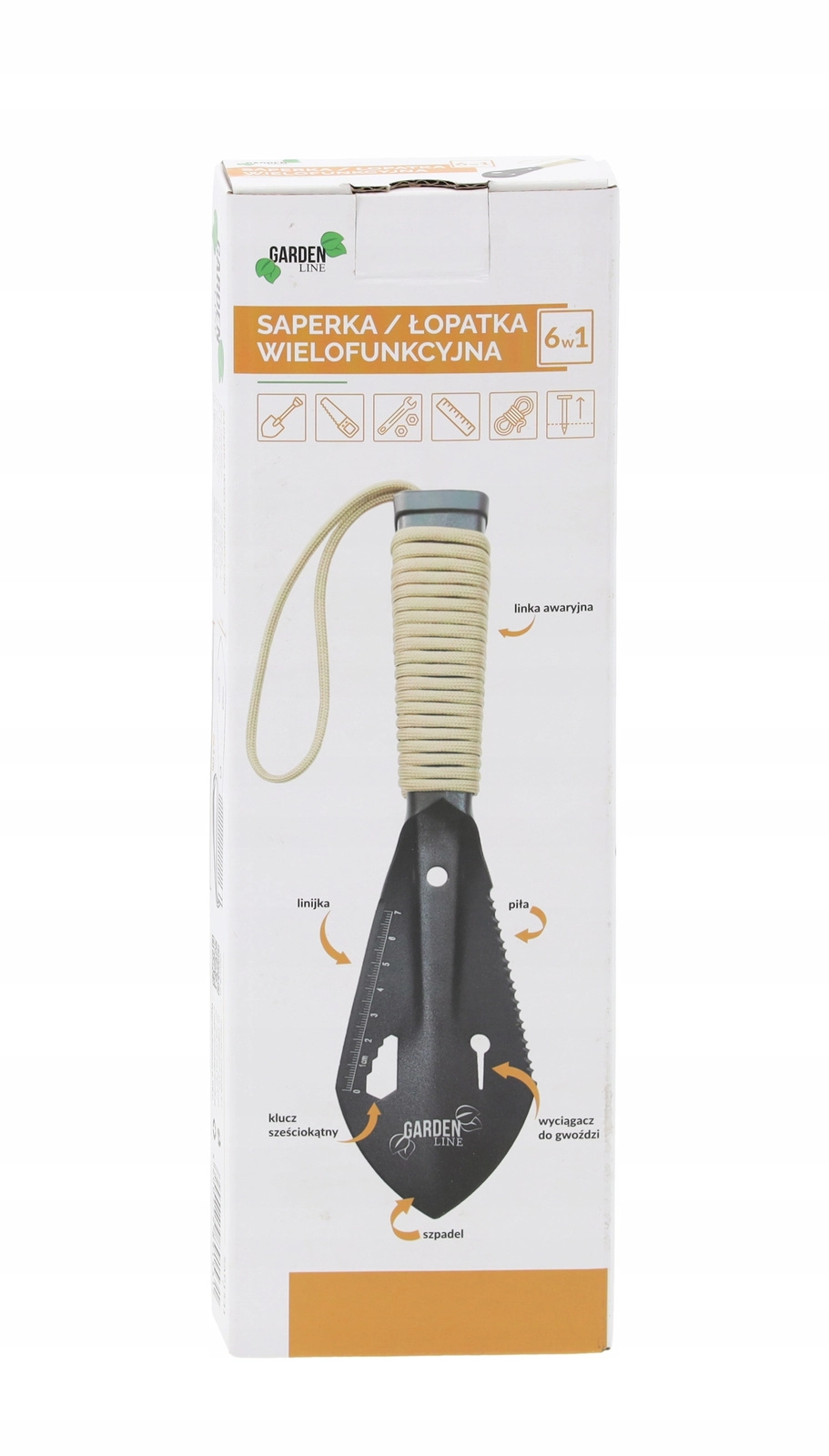 - 6 eszköz egyben: lapát, fűrész, szegkihúzó, hatlapkulcs, vonalzó, vészhelyzeti zsinór
