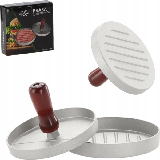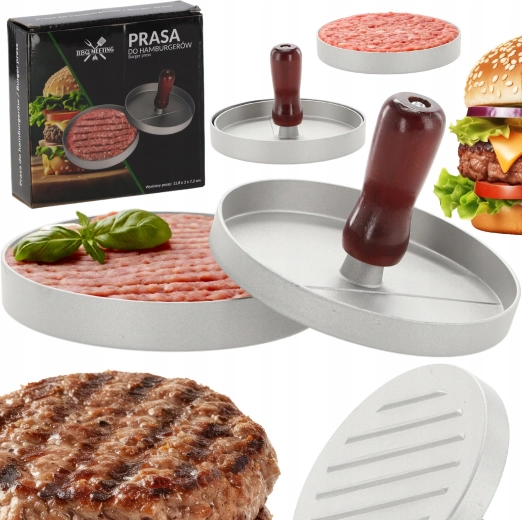 Ez a praktikus hamburgerprés egységes alakot és vastagságot biztosít a húspogácsáknak, így jobban átsülnek és profi megjelenést kapnak a tányéron. A tartós alumínium test stílusos szürke színben és a kényelmes fa fogantyú biztos fogást és hosszú élettartamot nyújt.