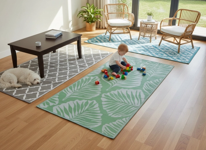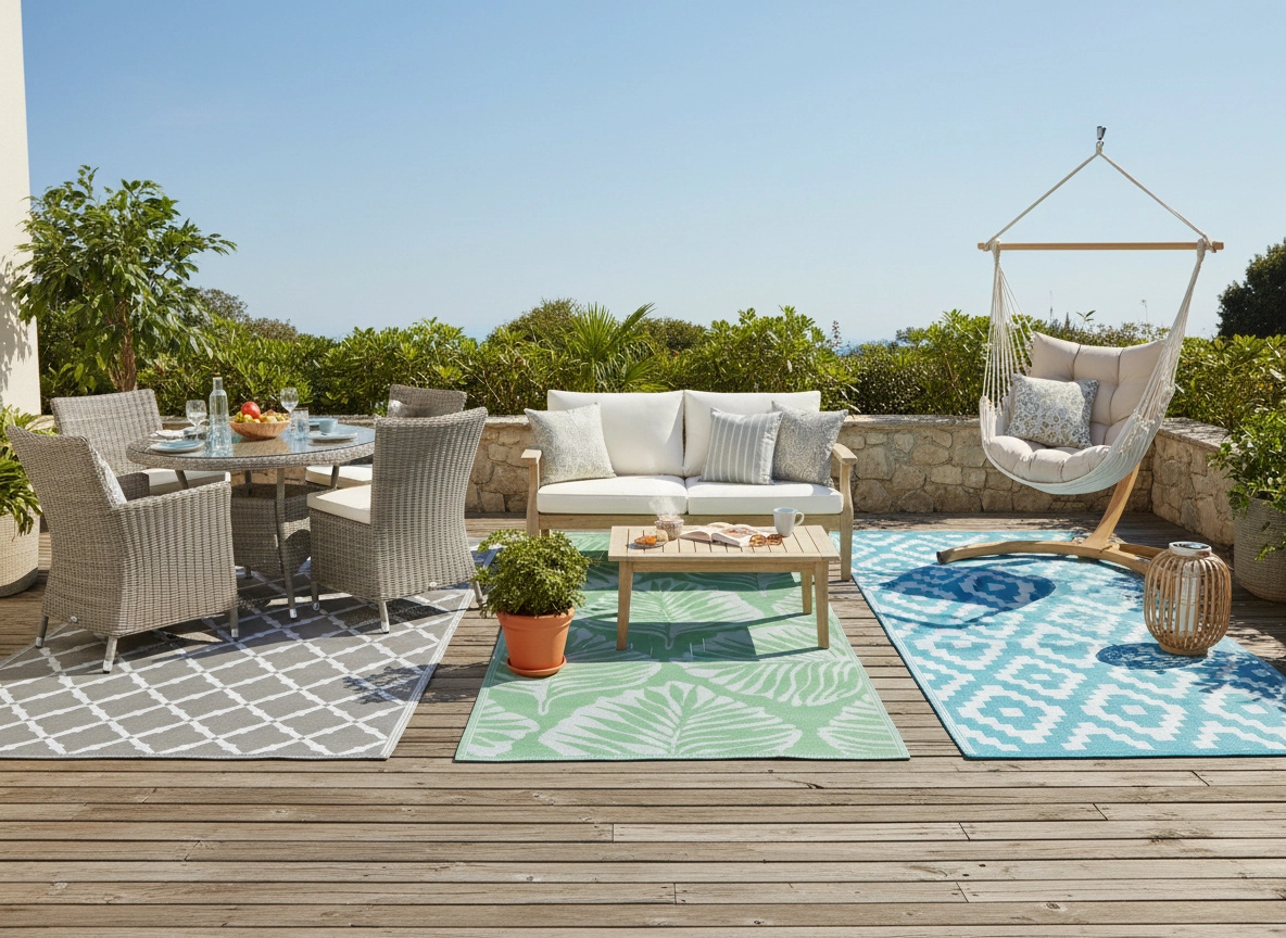 A lapos szövésű polipropilén szőnyeg ellenáll a nedvességnek és az időjárásnak, gyorsan szárad és egyszerűen tisztítható – ideális választás egész szezonban kültéri használatra.