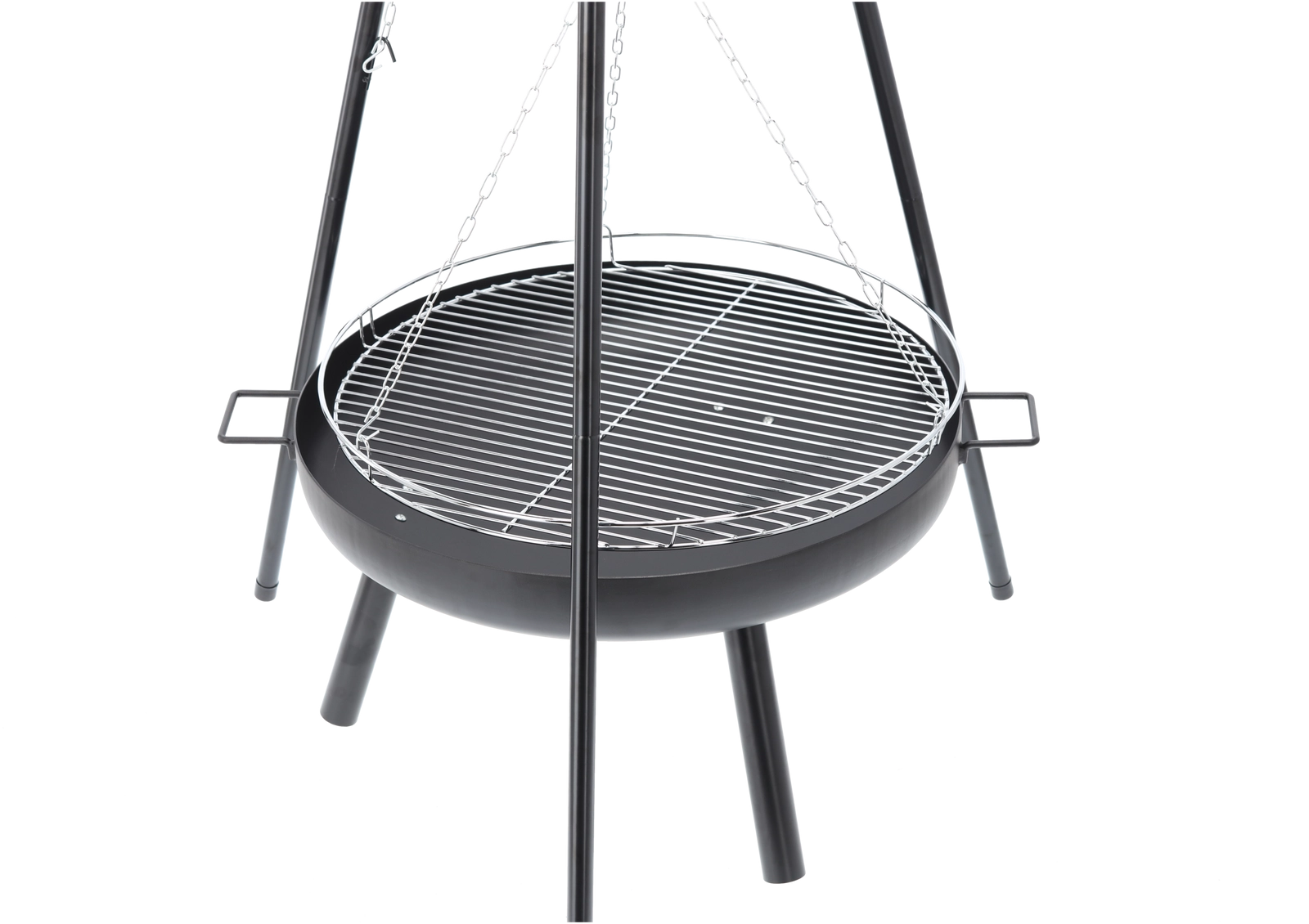 Élvezze a nyílt tűz varázsát és a kényelmes grillezést egyben. Ez a stabil háromlábon álló függőgrill fokozatmentes rácsmagasság-állítást, tágas, 60 cm átmérőjű tűzrakót és 58 cm-es krómozott grillrácsot kínál a tökéletes eredményért minden kültéri összejövetelen.