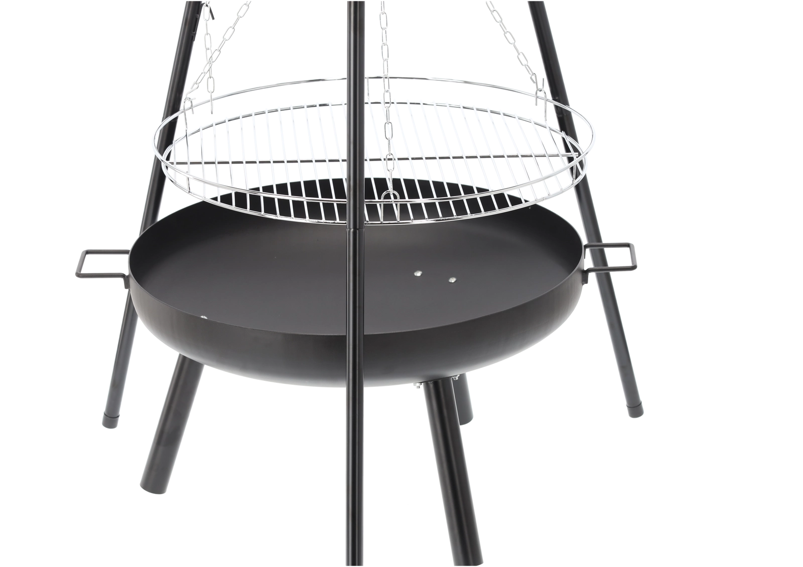 Stílusos 2 az 1-ben megoldás: tűzrakó és függőgrill. A 2 mm vastag acél tál hőálló, fekete bevonattal a gyakori használat mellett is tartós. A láncokra akasztott rácsnak köszönhetően egyszerűen beállítható a hőtől való távolság, így szaftos húsok, zöldségek és nyársak készíthetők ízlés szerint.