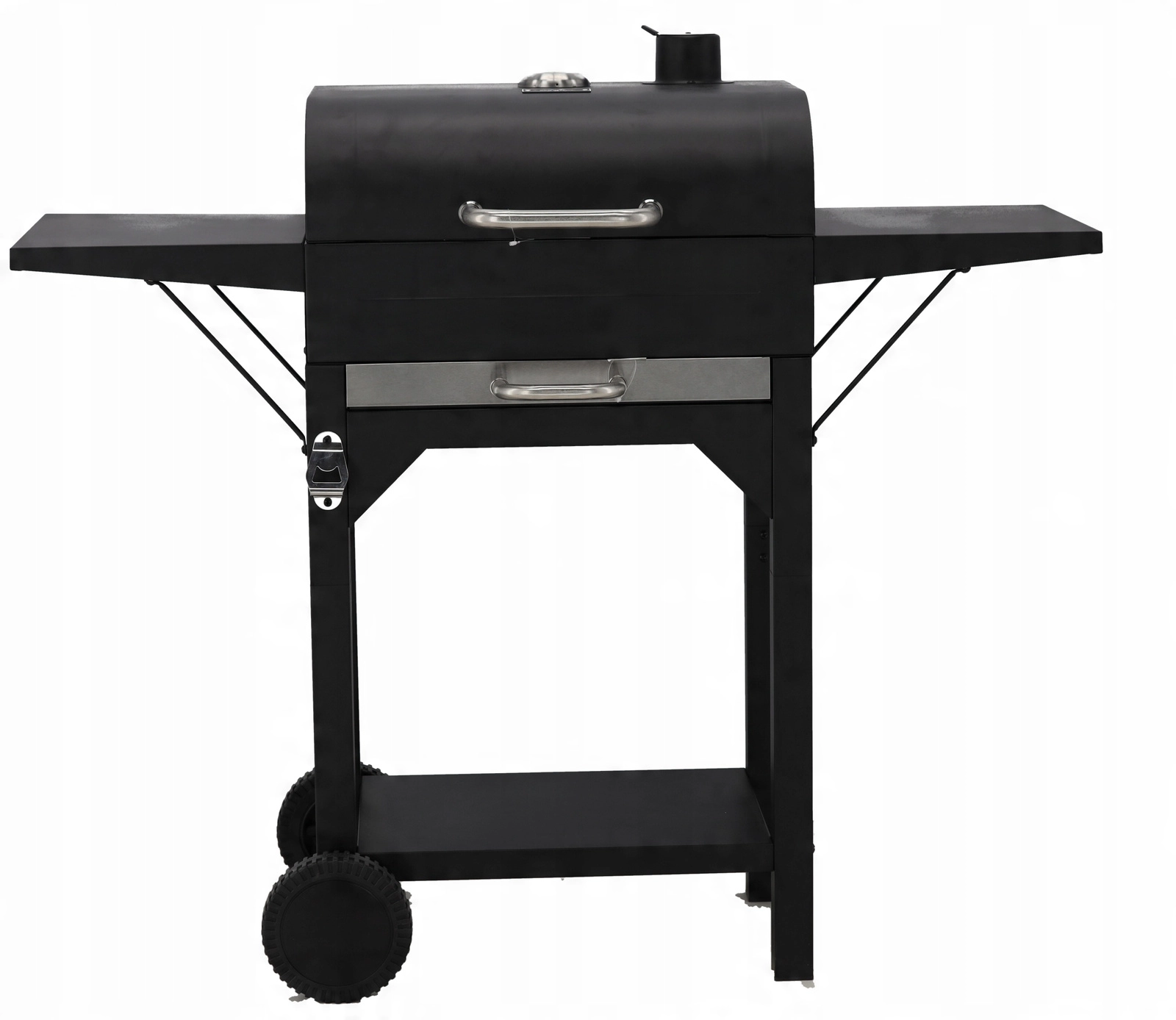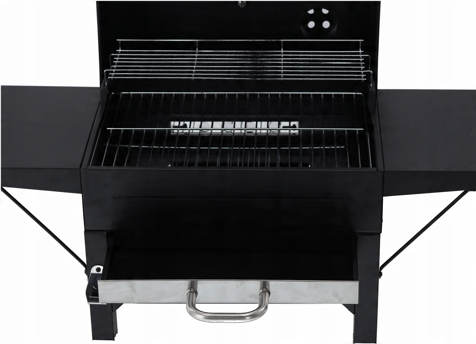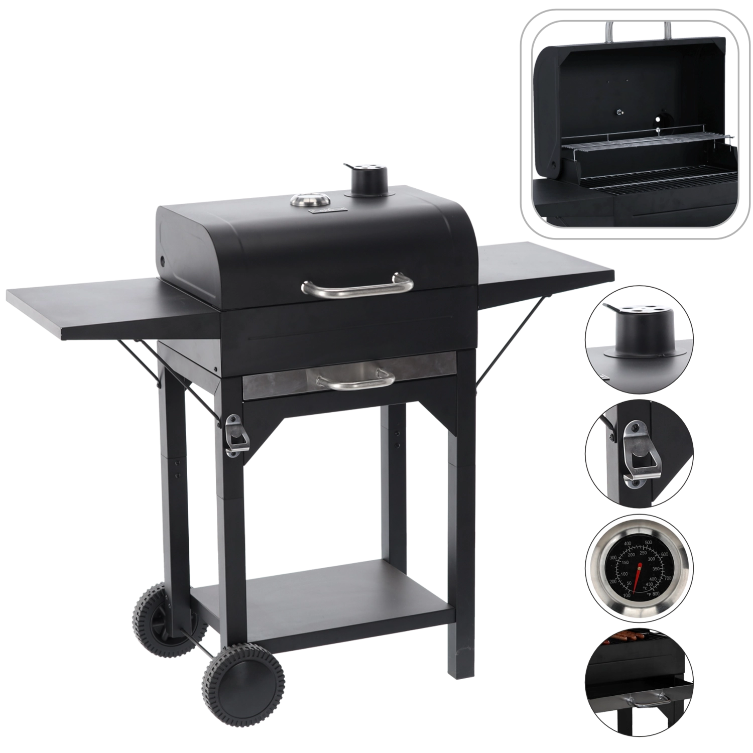 Átgondolt részletek a nagyobb kényelemért: a két darab, 30 × 34 cm-es lehajtható polc munkafelületet ad, a kihúzható hamutálca megkönnyíti a tisztítást, a szállítókerekek pedig lehetővé teszik a grill egyszerű áthelyezését. Nem hiányoznak a három rozsdamentes fogantyú a biztonságos kezeléshez, a 45 × 12 cm-es krómozott állvány a kellékekhez vagy melegen tartáshoz, valamint a horganyzott széntartó rács a hosszabb élettartamért.