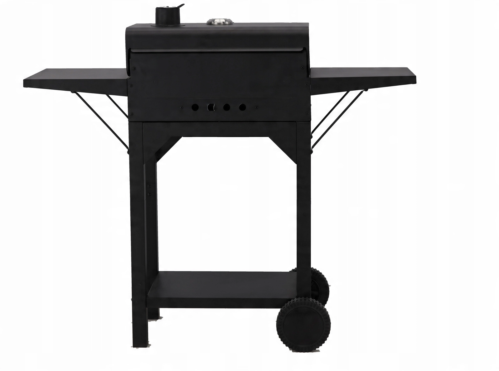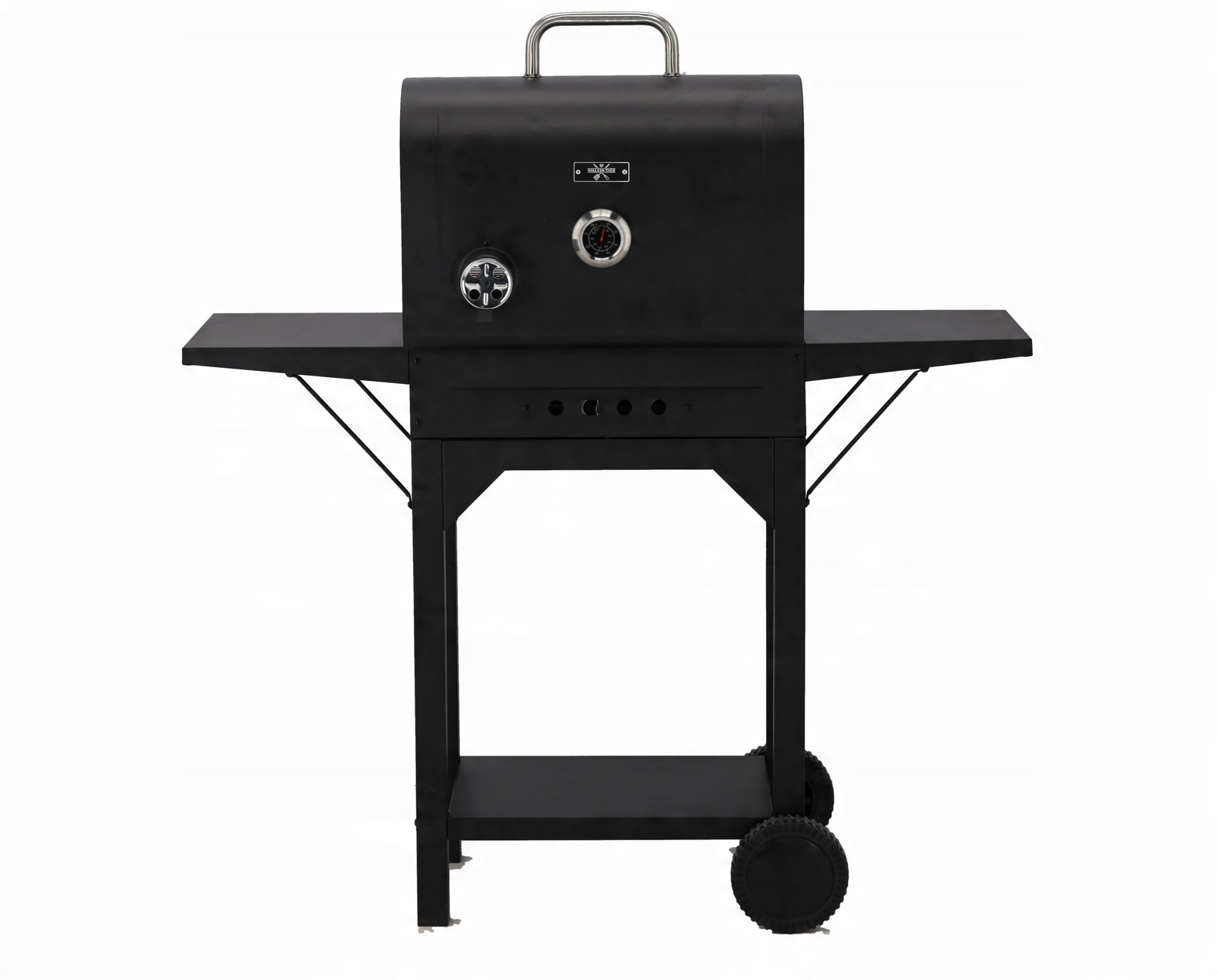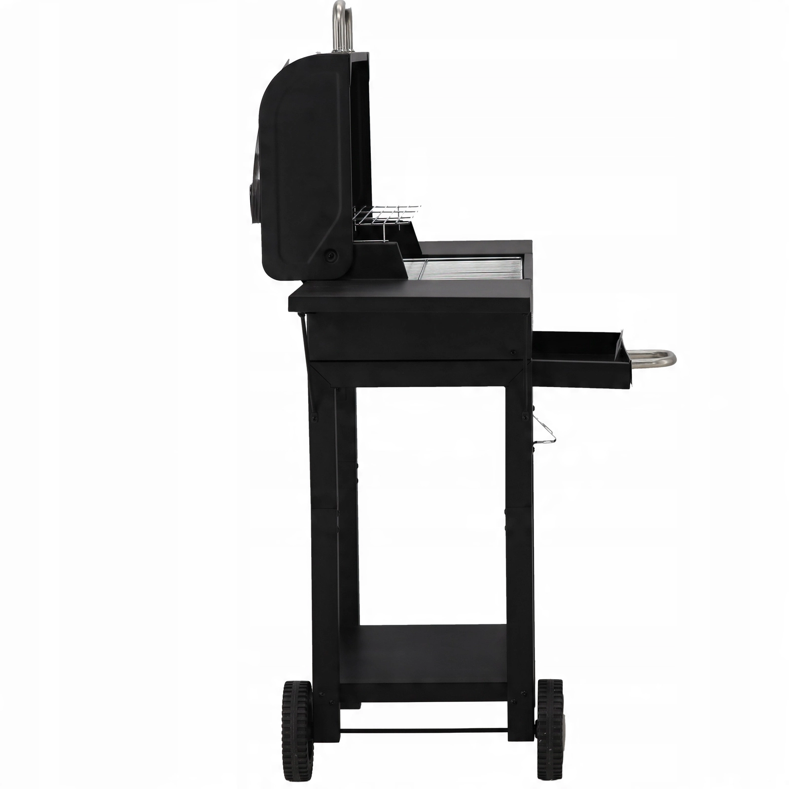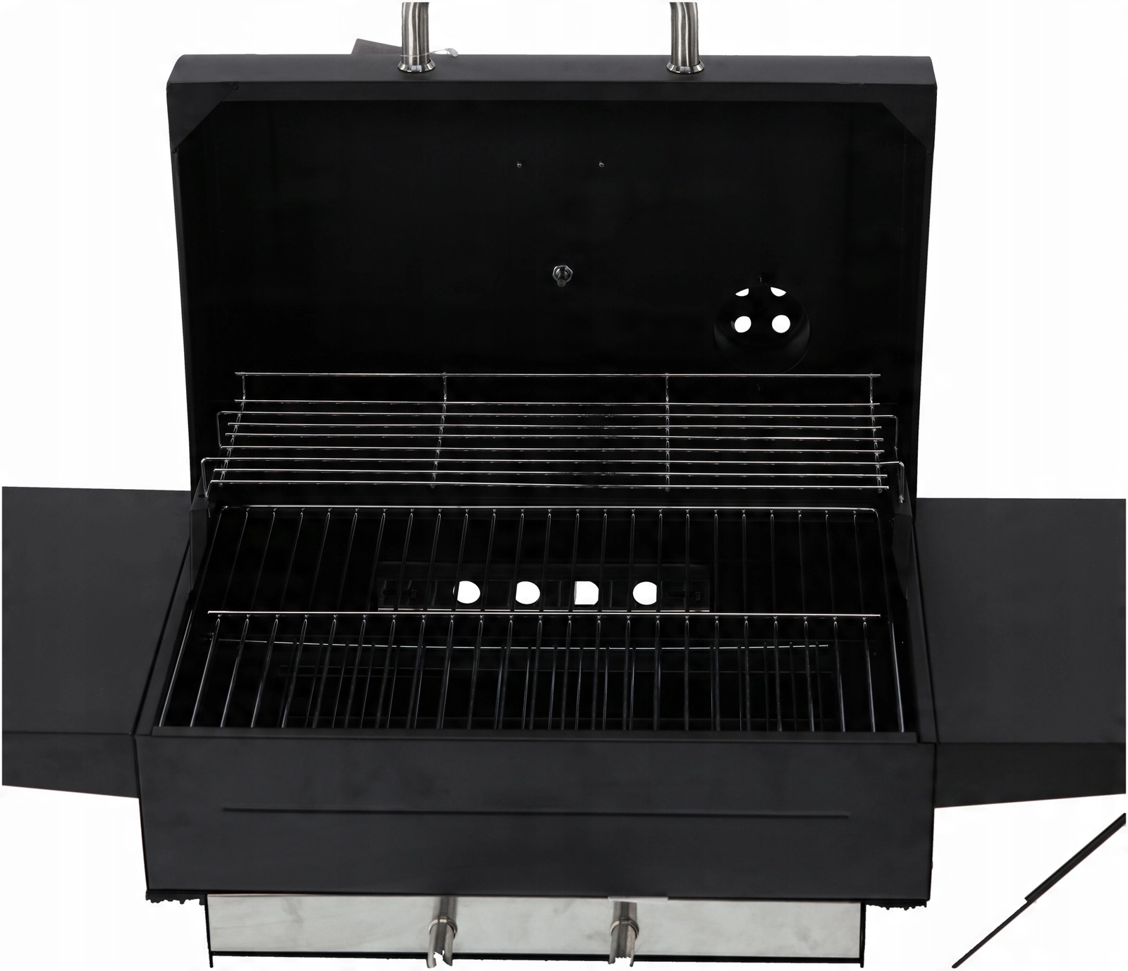 Átgondolt részletek a nagyobb kényelemért: a két darab, 30 × 34 cm-es lehajtható polc munkafelületet ad, a kihúzható hamutálca megkönnyíti a tisztítást, a szállítókerekek pedig lehetővé teszik a grill egyszerű áthelyezését. Nem hiányoznak a három rozsdamentes fogantyú a biztonságos kezeléshez, a 45 × 12 cm-es krómozott állvány a kellékekhez vagy melegen tartáshoz, valamint a horganyzott széntartó rács a hosszabb élettartamért.