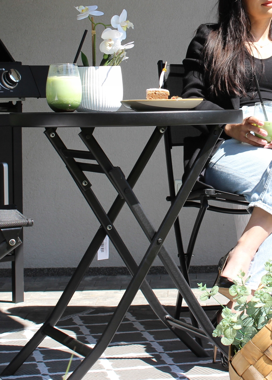 Keresztlábas kialakítása és az összecsukható mechanizmus gyors össze- és széthajtást, valamint kompakt tárolást vagy szállítást tesz lehetővé – tökéletes erkélyekre és kis teraszokra.