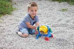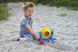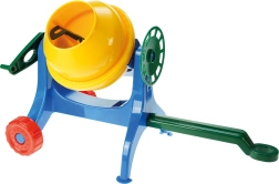 Ez a kis műanyag betonkeverő hűen utánozza az igazi építőgépet, és valósághű játékélményt nyújt. A forgó dobnak köszönhetően „keverhetik” a homokot vagy a vizet, így könnyedén készíthetnek keverékeket a kerti és homokozós építkezésekhez.