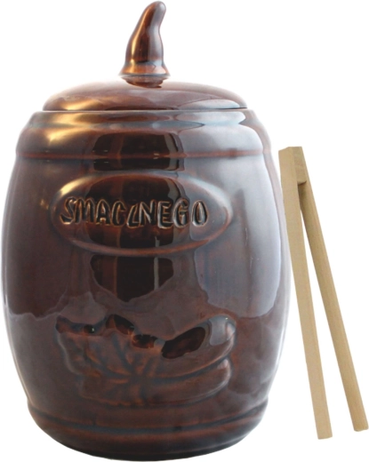Praktikus, 3,5 literes kerámia erjesztőedény, ideális házi savanyításhoz és uborka, valamint káposzta hosszú távú tárolásához. Saválló, nem mérgező, mázas kőedényből készül, amely nem befolyásolja az ízt, és biztonságos élelmiszer-tárolást biztosít. Kiváló hőszigetelő tulajdonságainak köszönhetően segít stabil hőmérsékletet fenntartani a megfelelő fermentációhoz. A csomag tartalmaz fa csipeszt a higiénikus kivételhez.