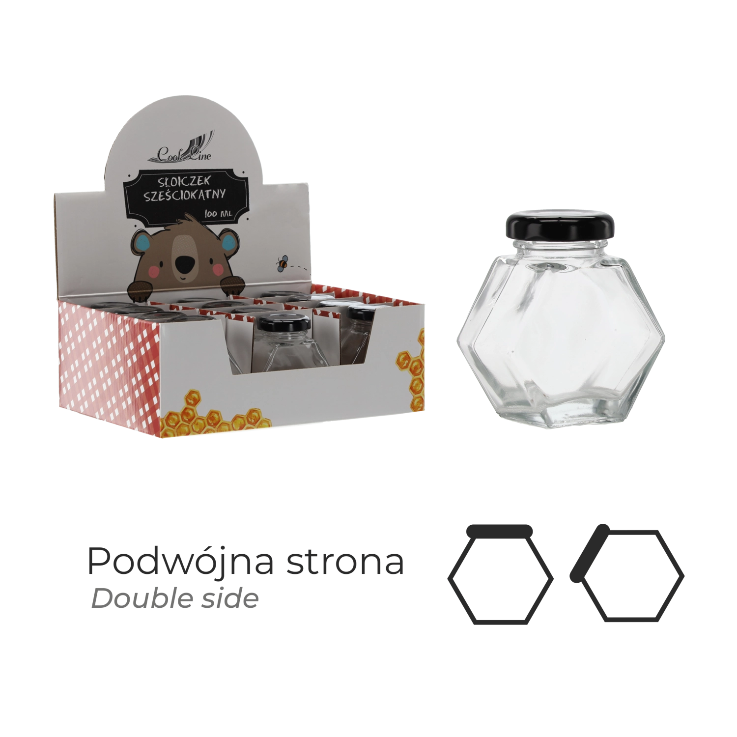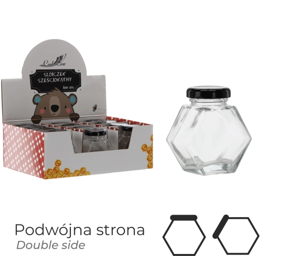 Az elegáns, 100 ml-es hatszögletű üveg kiváló választás méz, lekvár, fűszerek, gyógynövények vagy apró finomságok tárolására. A szorosan záródó tetőnek köszönhetően a tartalom tovább marad friss és biztonságosan lezárt. Kompakt mérete jól illik a konyhába, ajándékszettekhez és házi készítéshez is.