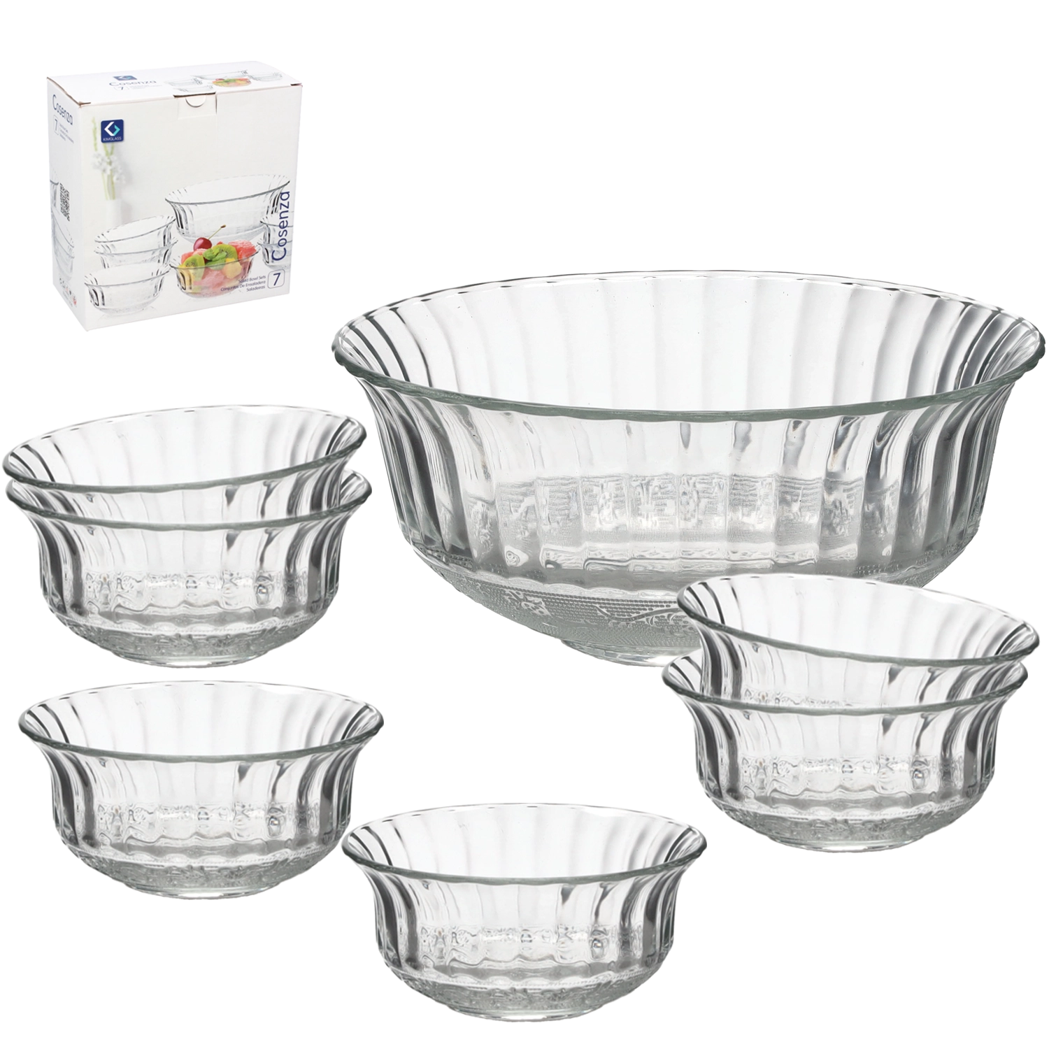 Elegáns Cosenza üvegtálkészlet stílusos saláták, köretek és desszertek tálalásához. Tartalmaz 1 nagy tálat (20 cm) és 6 kisebb tálkát (11,6 cm). A minőségi átlátszó üveg kiemeli az ételek megjelenését, és könnyen tisztítható – ideális mindennapi használatra és ünnepi asztalhoz.