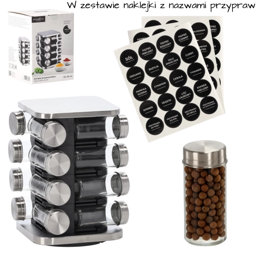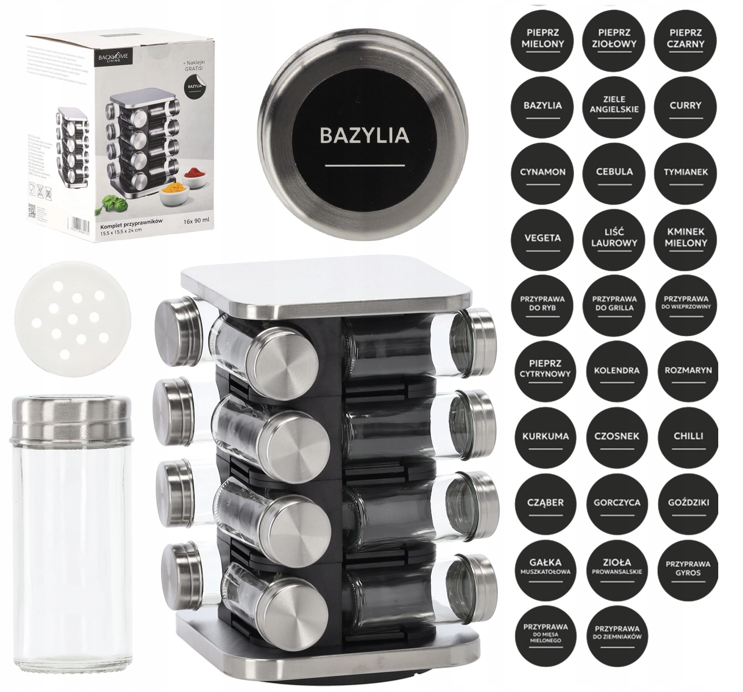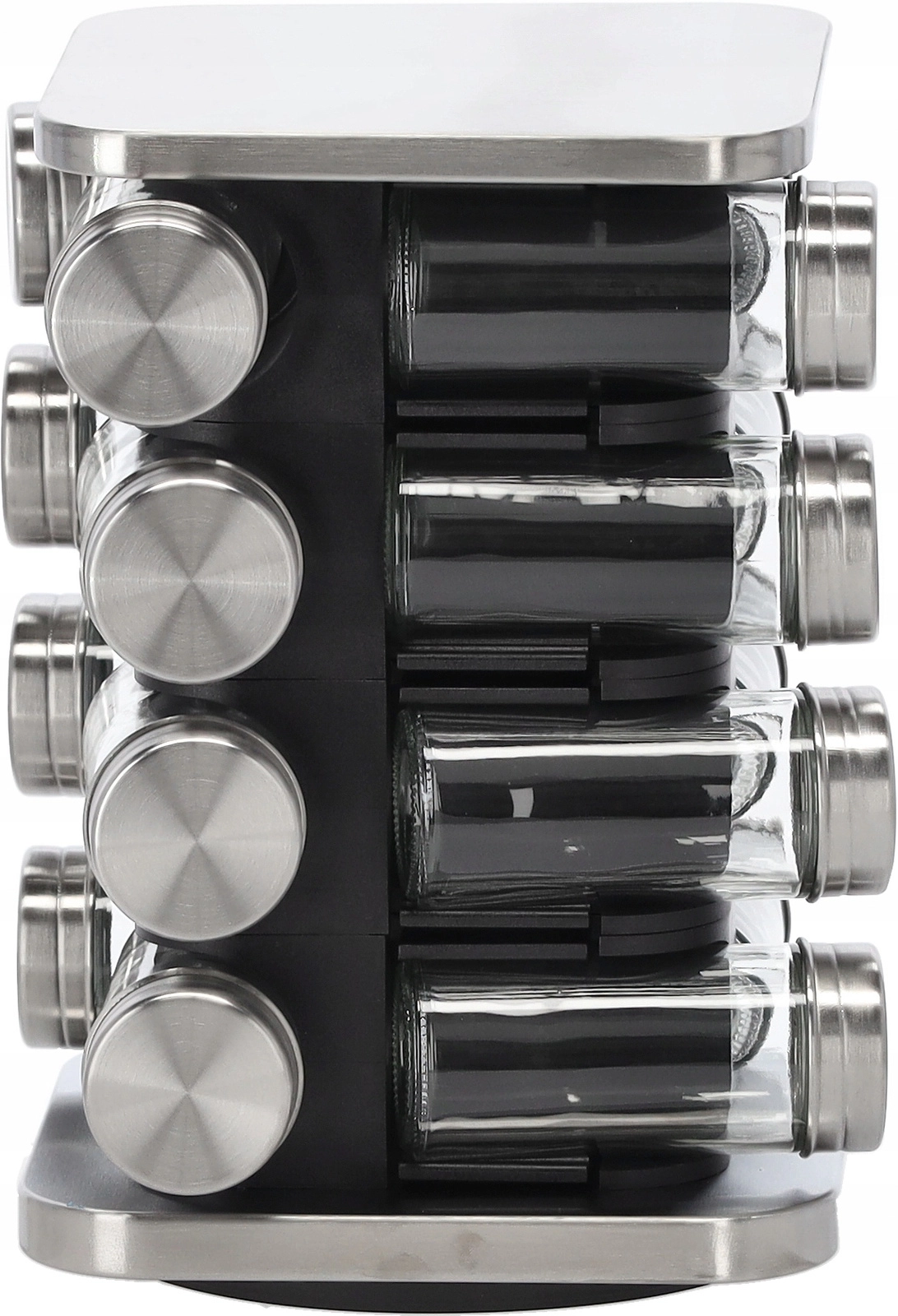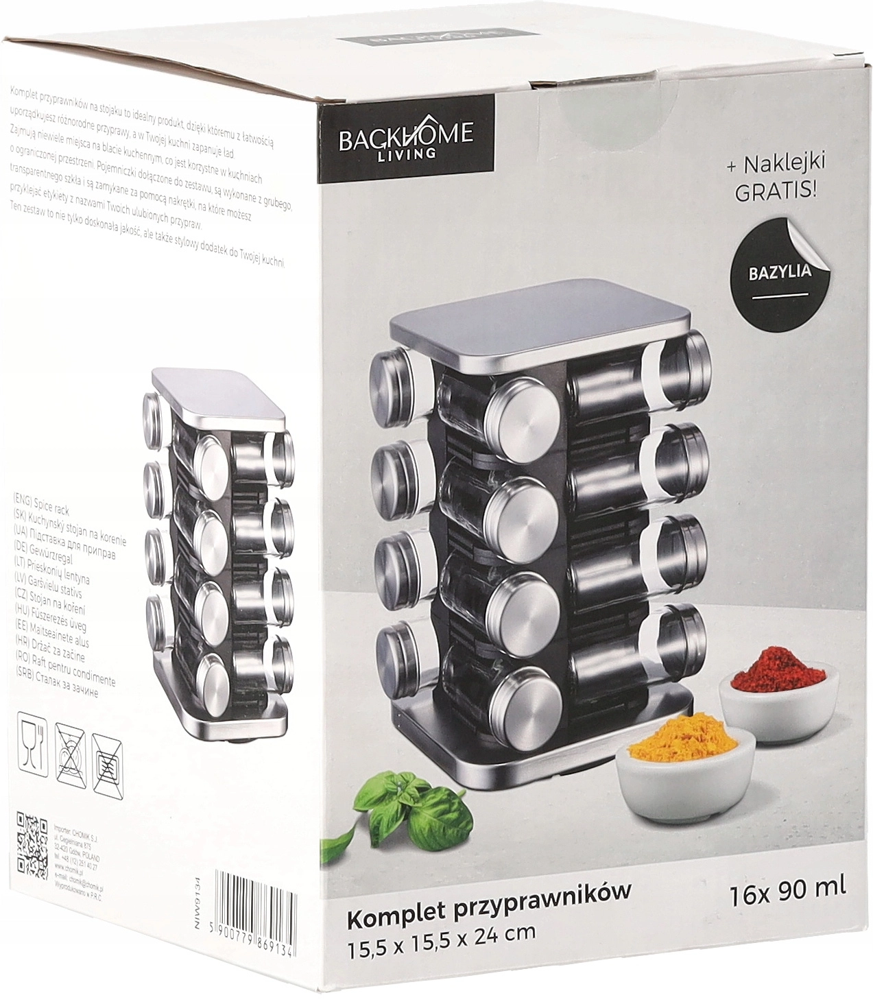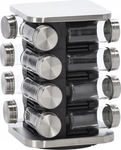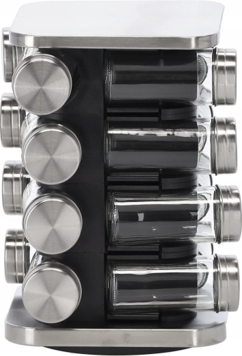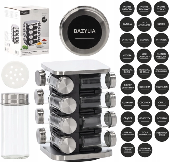 Elegáns, négyszögletes fűszertartó állvány 15,5 × 15,5 × 24 cm méretben, amely áttekinthető tárolást és gyors hozzáférést biztosít a kedvenc fűszerekhez. Tartalmaz 16 átlátszó üveg fűszertartót csavaros acél fedőkkel, valamint praktikus, forgatható kialakítást a kényelmes használathoz. A csomag része egy 38 darabos matrica készlet a fűszerek könnyű feliratozásához.