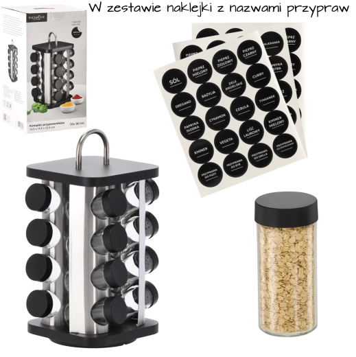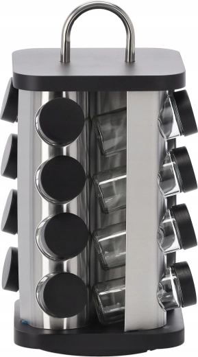 A forgó mechanizmusnak köszönhetően kedvenc hozzávalói mindig kéznél lesznek. Az üvegfiolák 4 oszlopban, oszloponként 4 darab elrendezésben találhatók, ami kiváló áttekinthetőséget és helytakarékosságot biztosít. A 38 darab matrica a fűszerek nevével segít a személyre szabásban és a tökéletes konyhai rend fenntartásában.