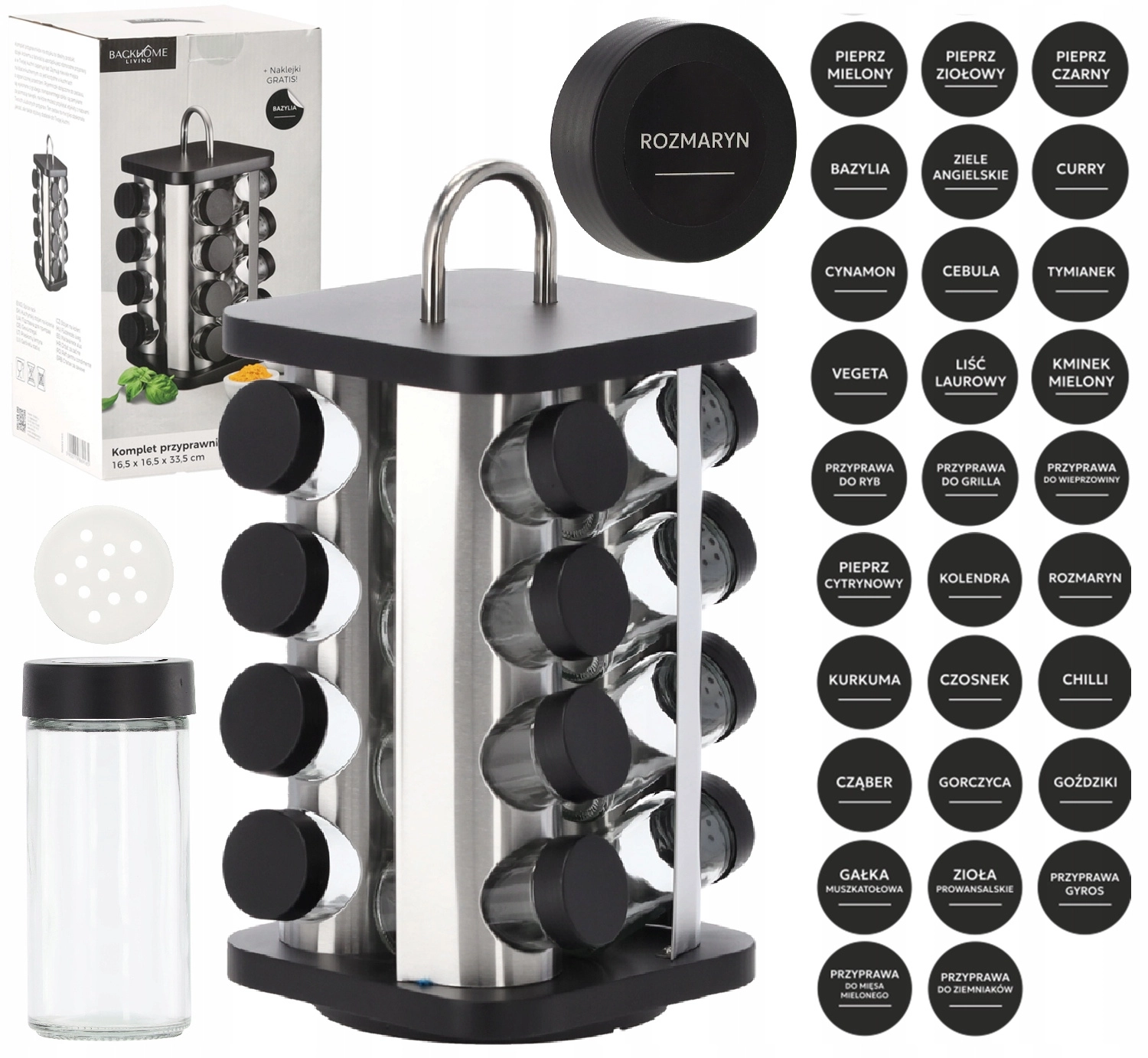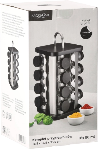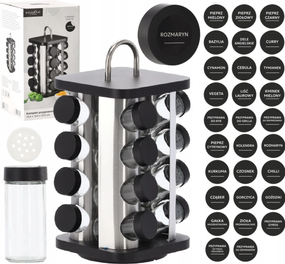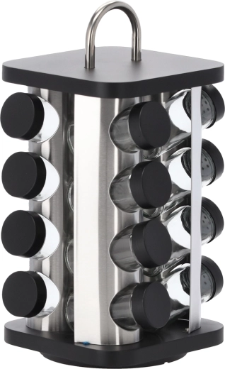 Elegáns, forgó fűszertartó állvány 16,5 × 16,5 cm-es négyzetes talppal és 33,5 cm magassággal, amely áttekinthető és stílusos tárolást kínál a fűszereknek. Praktikus fogantyúval rendelkezik a könnyű hordozhatóságért, 16 darab üveg fiolát (90 ml) tartalmaz, és tartós rozsdamentes acélból készült fekete fedőkkel. A forgó kialakítás gyors hozzáférést biztosít minden fűszerhez, a csomagot pedig 38 darab matrica egészíti ki az egyértelmű feliratozáshoz.