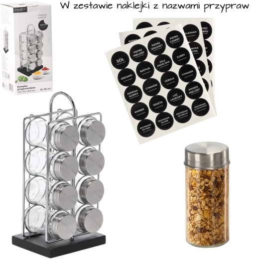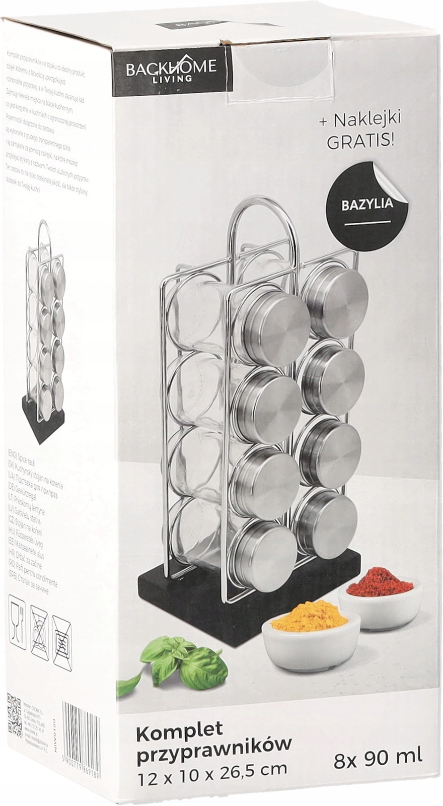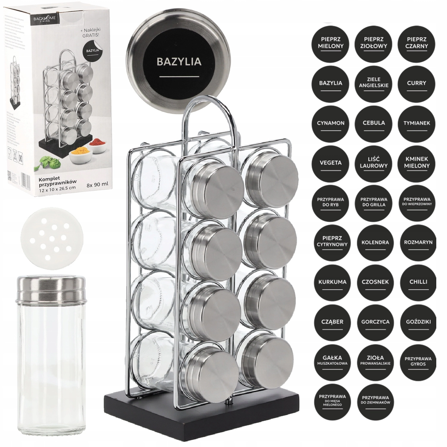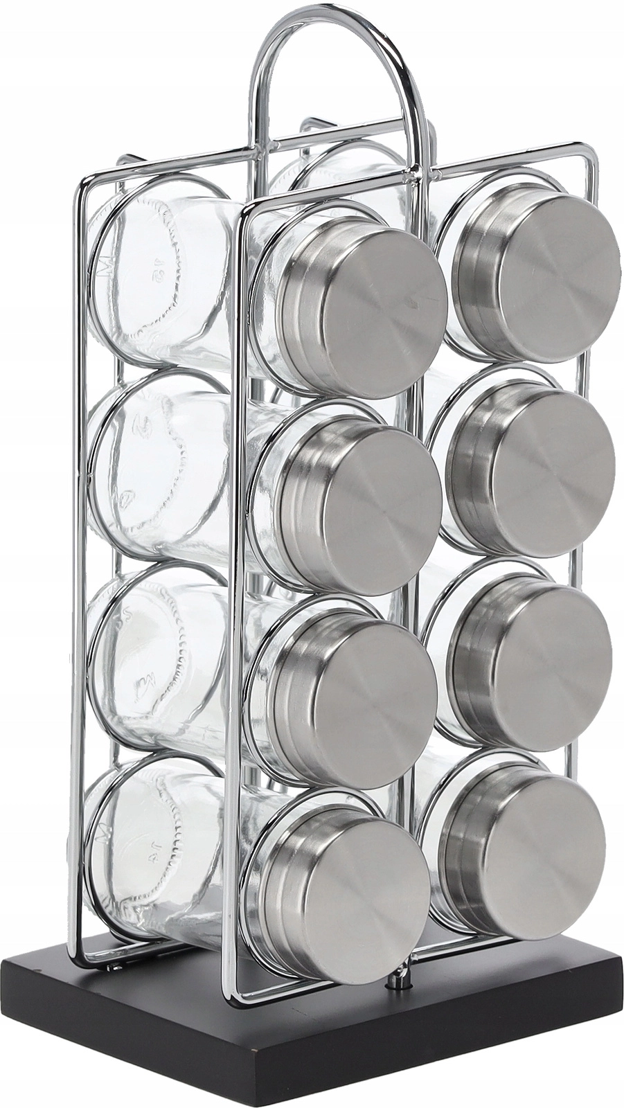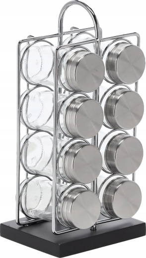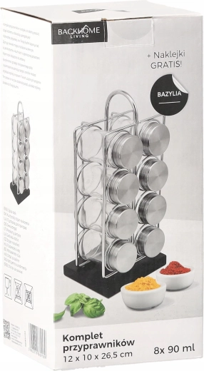 A csomag tartalmaz 8 átlátszó üveg fűszertartót (90 ml) rozsdamentes acél fedőkkel. 2 oszlopban, 4–4 elrendezésben találhatók a gyors hozzáférésért. A fogantyú megkönnyíti az egész állvány áthelyezését a pulttól a főzőlaphoz vagy az asztalhoz.
