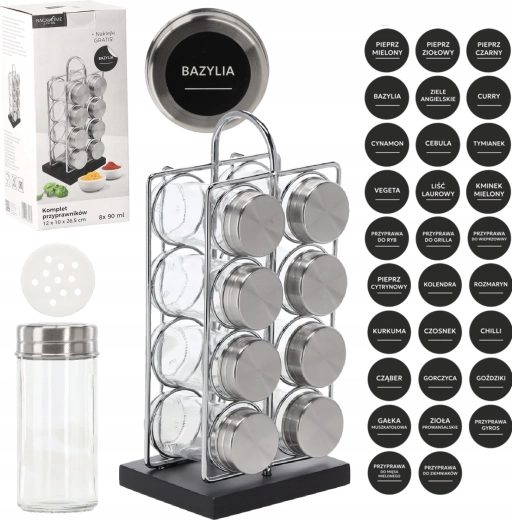 Stílusos és praktikus fűszertartó állvány a mindennapi főzéshez. Masszív acél szerkezetet és MDF alapot kínál, 8 üveg fűszertartóval (90 ml), rozsdamentes acél fedőkkel, valamint kényelmes fogantyúval az egyszerű hordozhatóságért. A csomag része 38 matrica fűszernévvel a gyors eligazodás és személyre szabás érdekében.