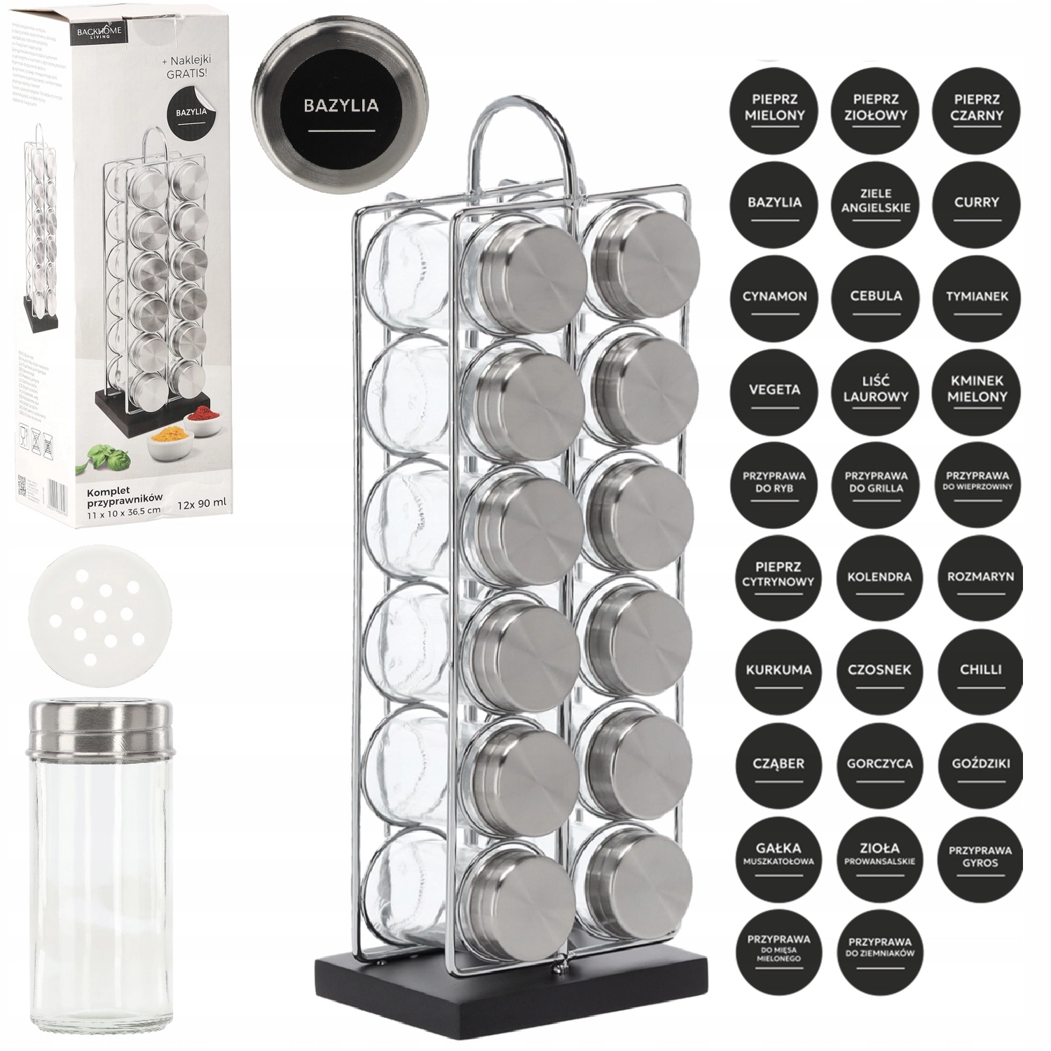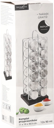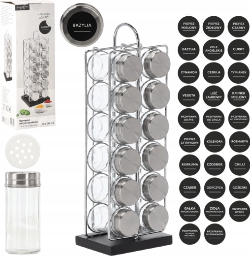 A csomagban 12 átlátszó üveg fűszertartót talál 90 ml űrtartalommal és csavaros rozsdamentes acél tetőkkel, amelyek megőrzik a fűszerek aromáját és frissességét. A 2 oszlopban, 6–6-os elrendezés megkönnyíti a gyors keresést és helyet takarít meg a pulton.