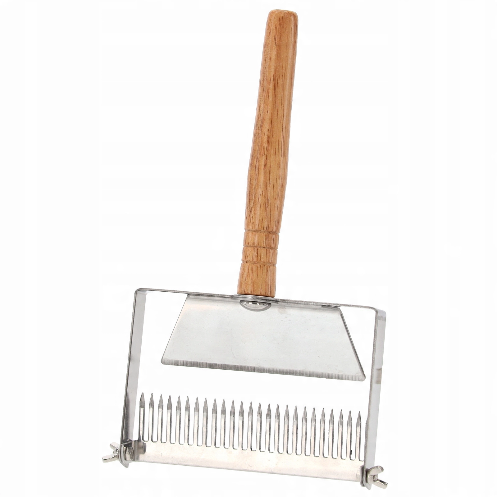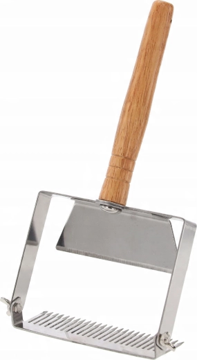 Ez a professzionális fedelezővilla tartós rozsdamentes acélból készül, amely könnyen tisztítható, és nem befolyásolja a méz ízét vagy minőségét. Az ergonomikus fa nyél biztos fogást és kényelmes munkavégzést nyújt hosszabb használat esetén is.
